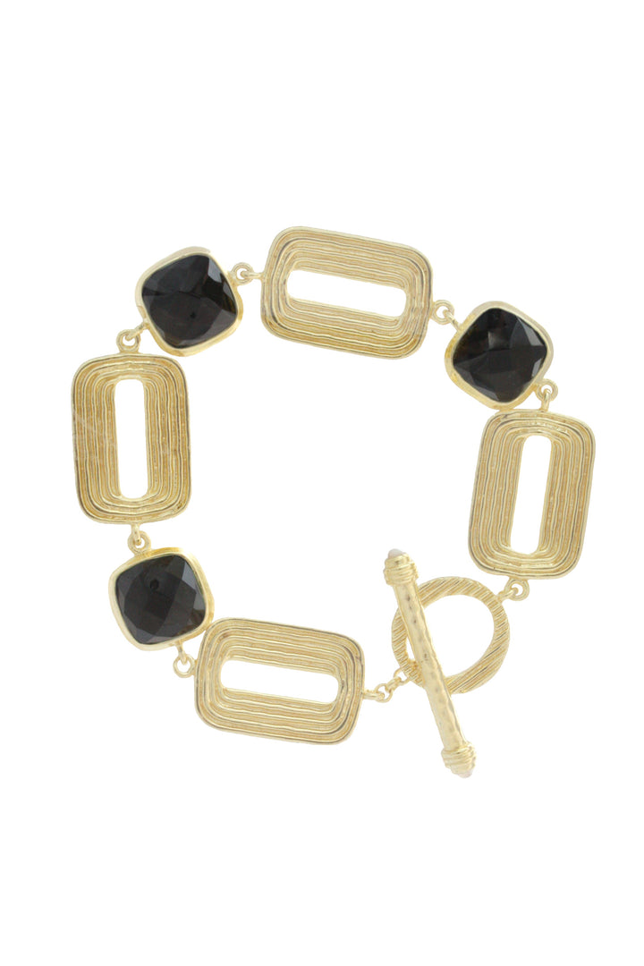 The Della Bracelet by Marcia Moran offers a delicate, elegant design in 18k gold plating. Featuring a single small faceted gemstone with textured U-shaped detail, this bracelet is a refined addition to any jewelry collection. Handmade in Brazil.