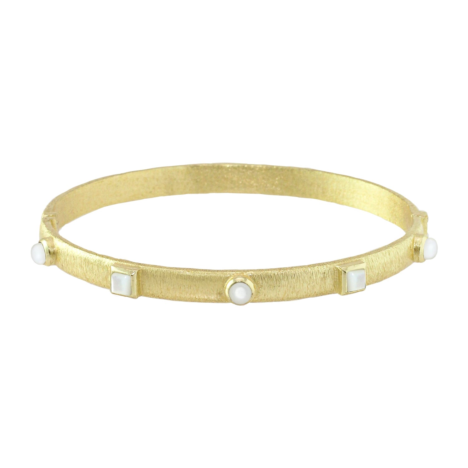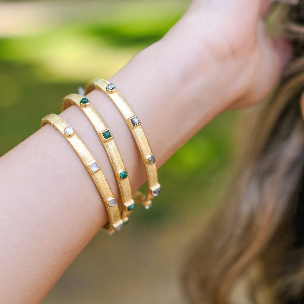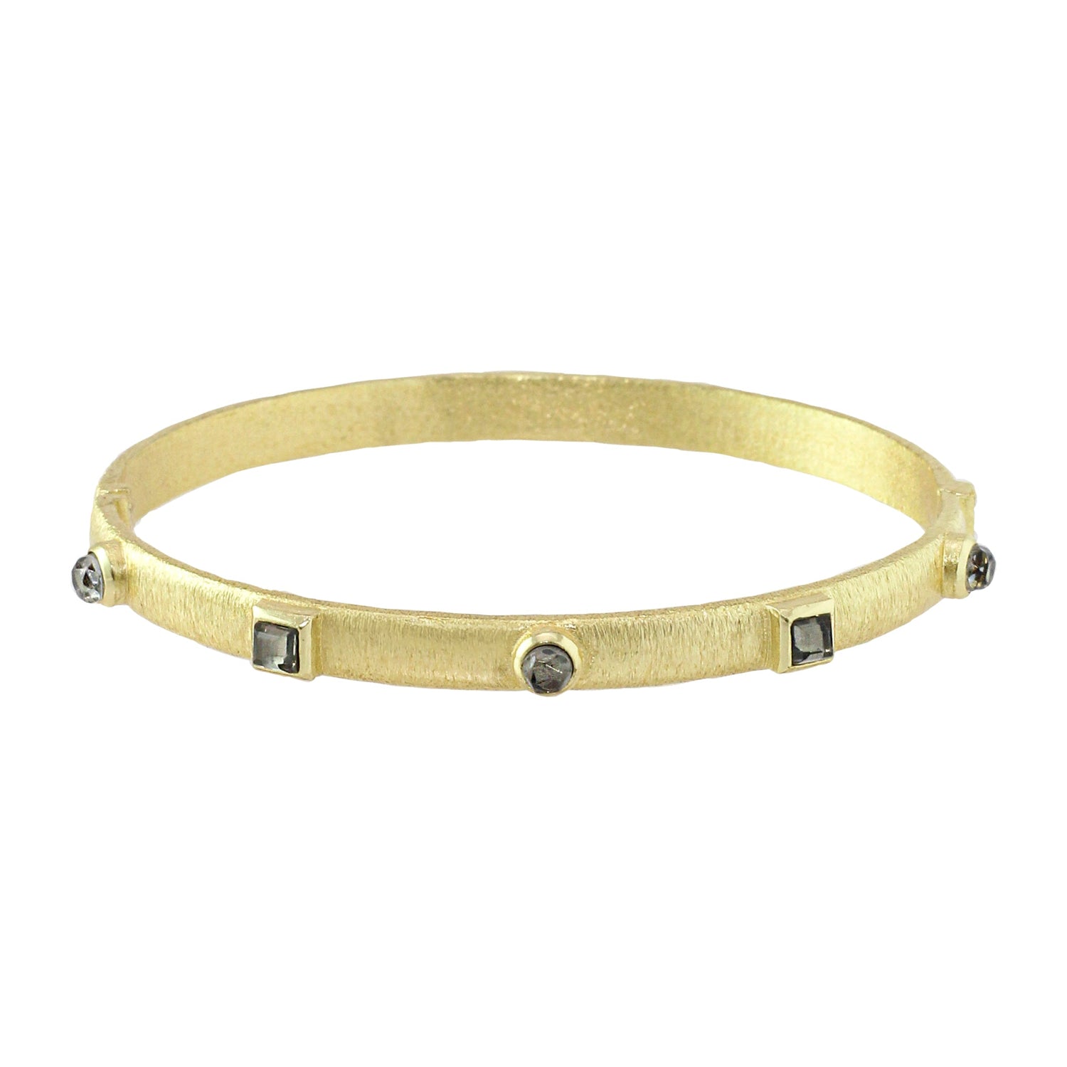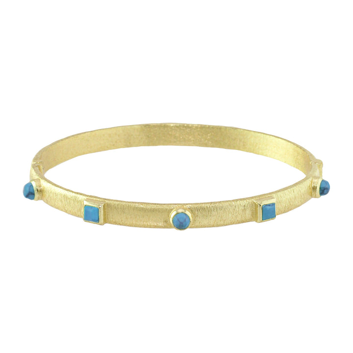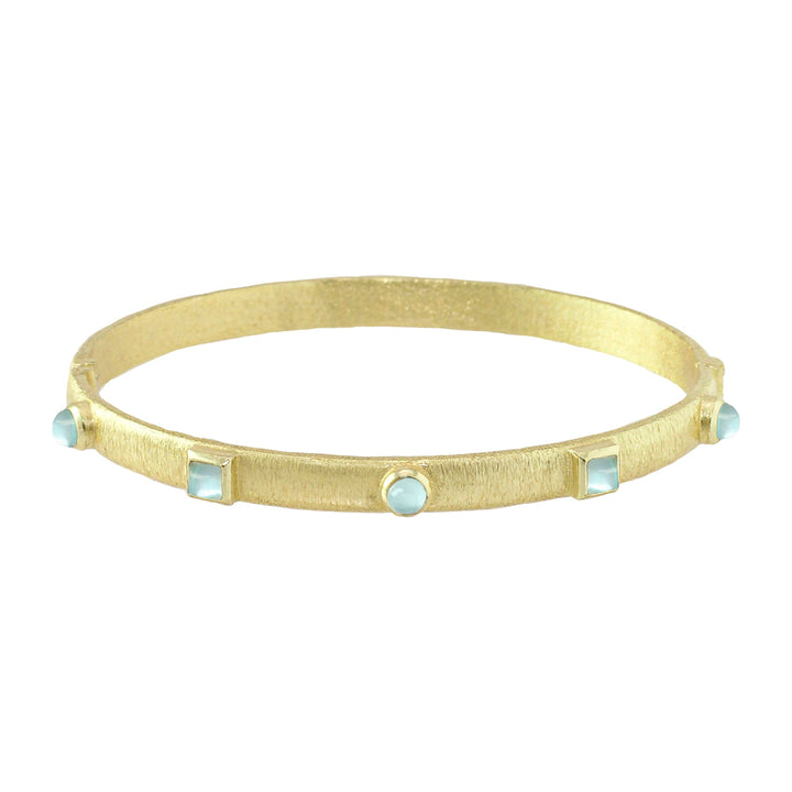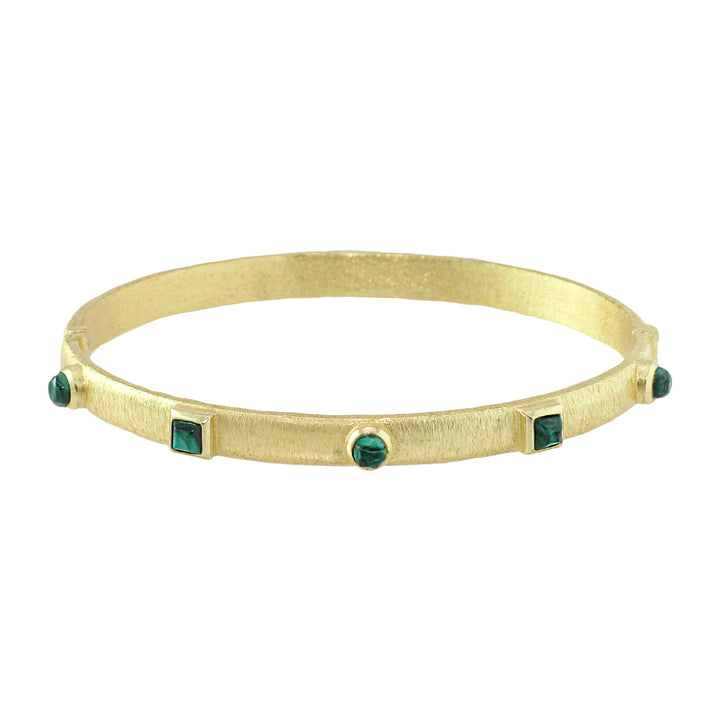 The Kota Hinge Bracelet by Marcia Moran is a thin bangle adorned with stone accents, offering a simple yet refined look. Its delicate design is perfect for layering or as a subtle statement piece. Handmade in Brazil, this bracelet adds a touch of elegance to any style.