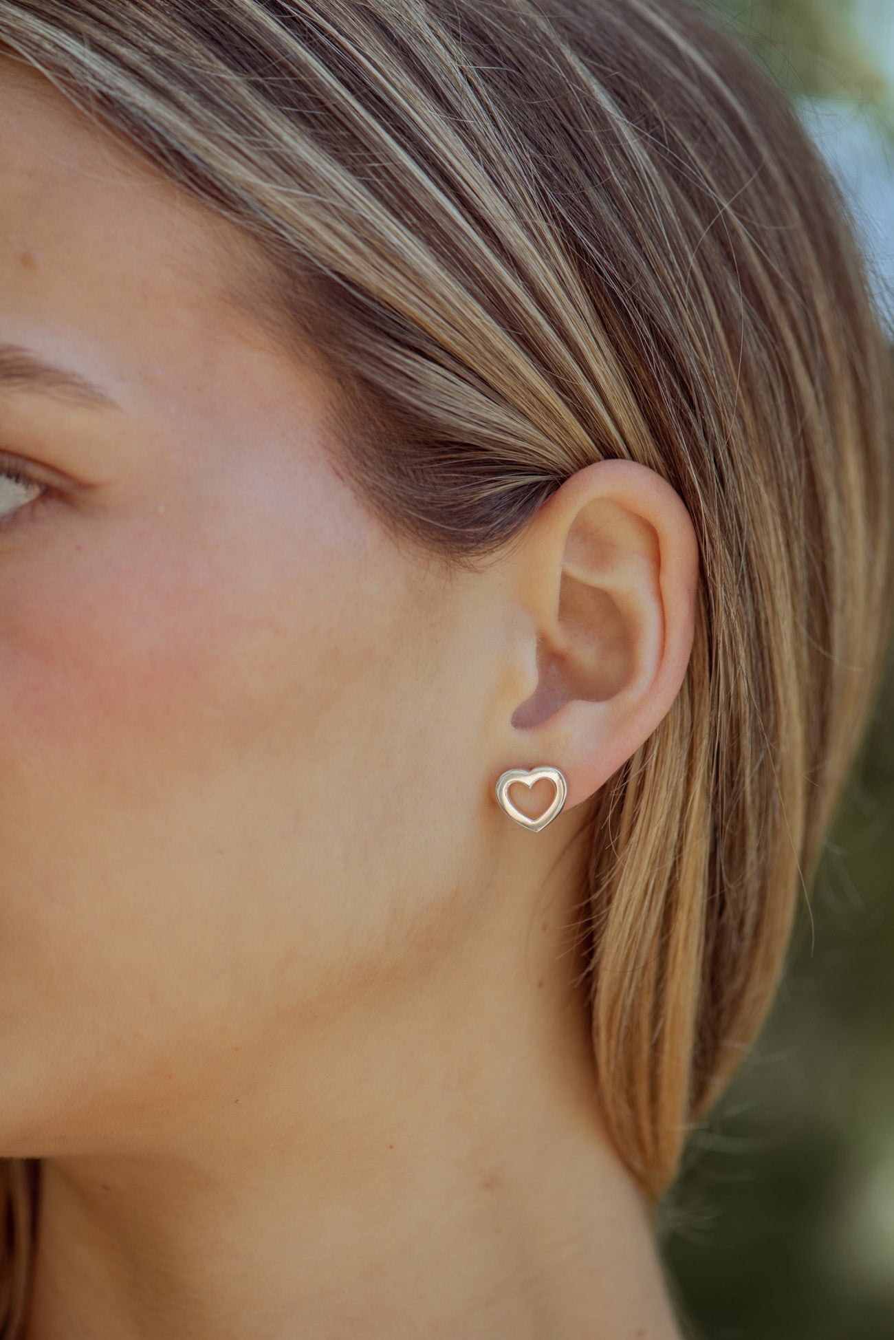 The Cyra Studs by Marcia Moran are sterling silver open heart studs, measuring 0.5 inches. Their simple yet elegant design makes them a versatile accessory, complementing any outfit with ease.