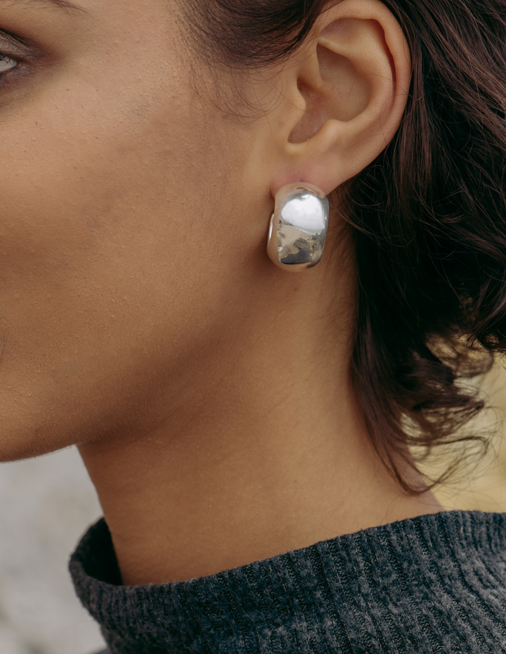 The Tillie Hoops by Marcia Moran are thick sterling silver hoops that measure 0.75 inches in diameter and width. These lightweight earrings feature a bold, contemporary design, making them a standout accessory.