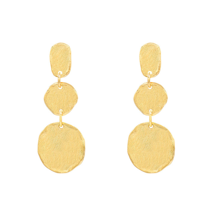 The Myla Earrings by Marcia Moran feature 18k gold-plated post earrings with three organic coin shapes. Measuring 1.5 inches, these versatile and elegant earrings pair beautifully with the Suz and Dorine necklaces for a sophisticated, coordinated look. Handmade in Brazil.