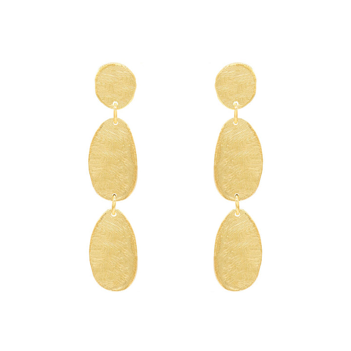 The Nadia Earrings by Marcia Moran showcase a nature-inspired design with three 18k gold-plated organic coins. Measuring 2 inches, these distinctive earrings are perfect for those who appreciate unique and artisanal jewelry. Handmade in Brazil.