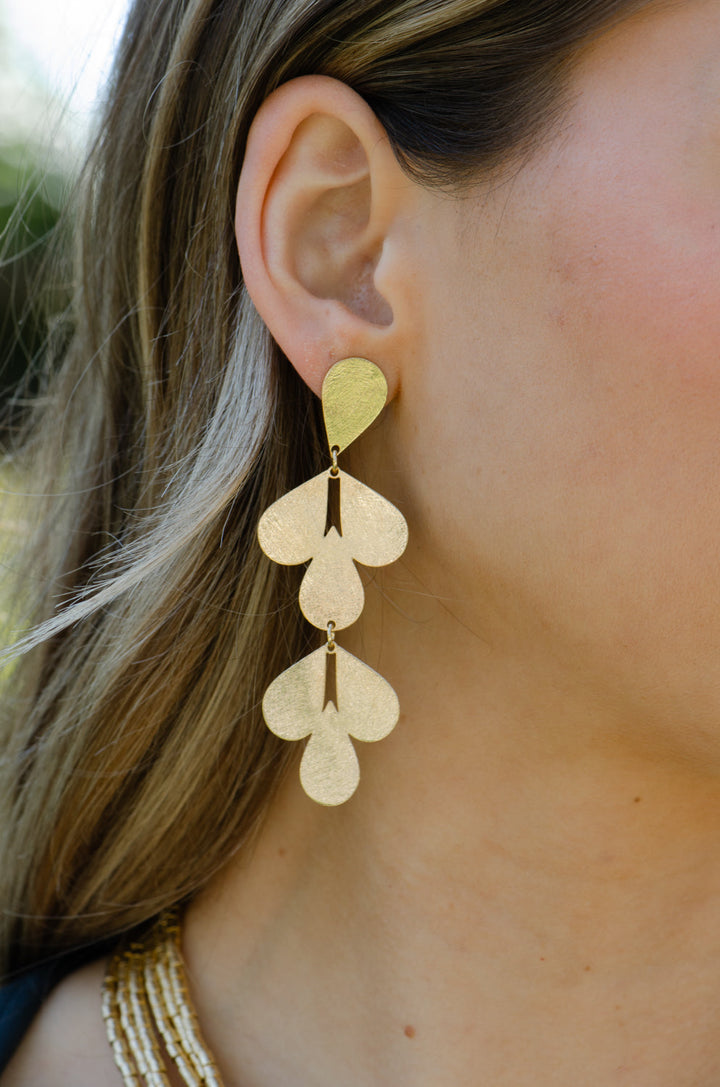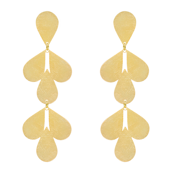 The Atlaua Earrings by Marcia Moran are dramatic and elegant, featuring six cascading drops from a teardrop base. Measuring 3.25 inches, these 18k gold-plated earrings are handmade in Brazil, showcasing beautiful craftsmanship.