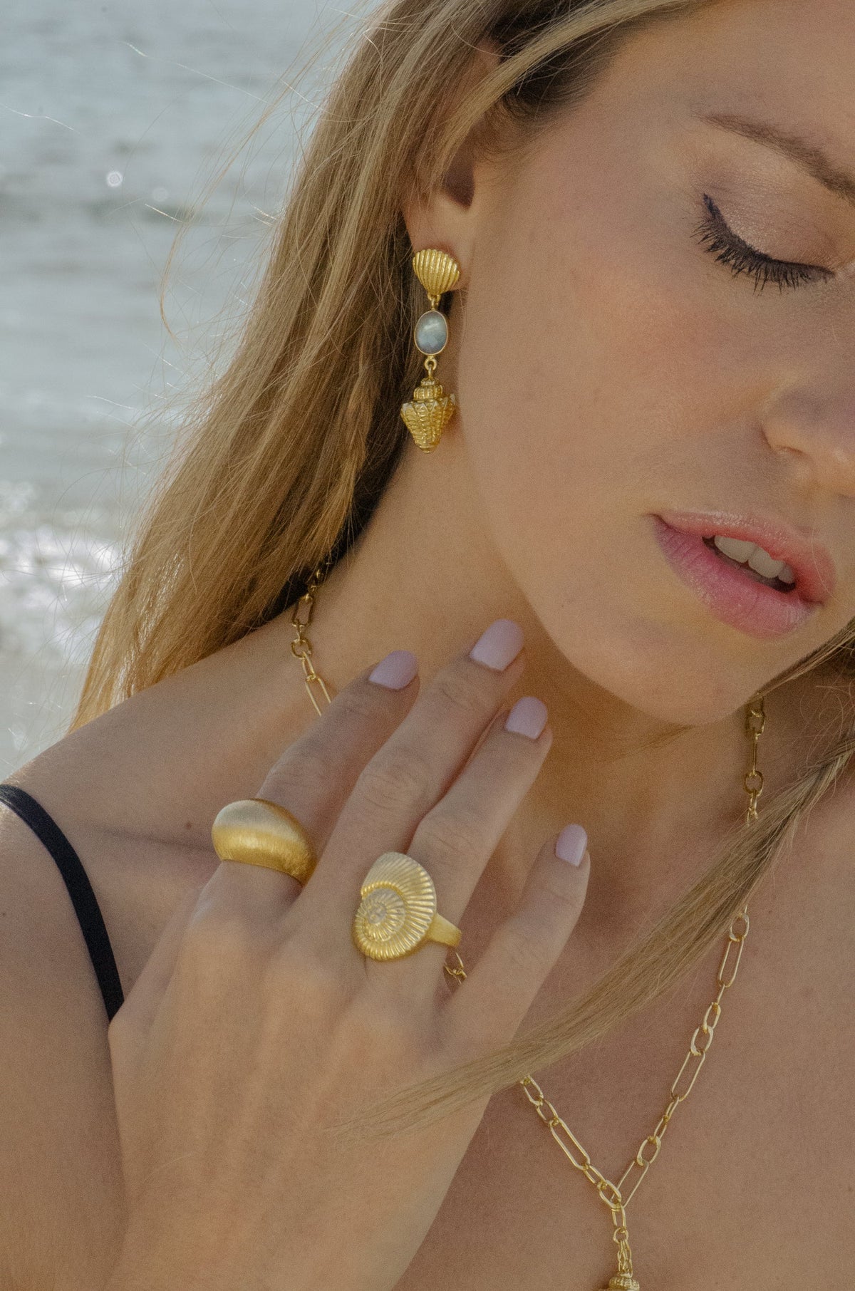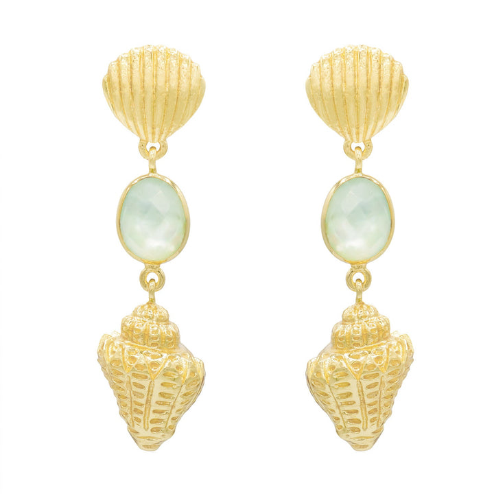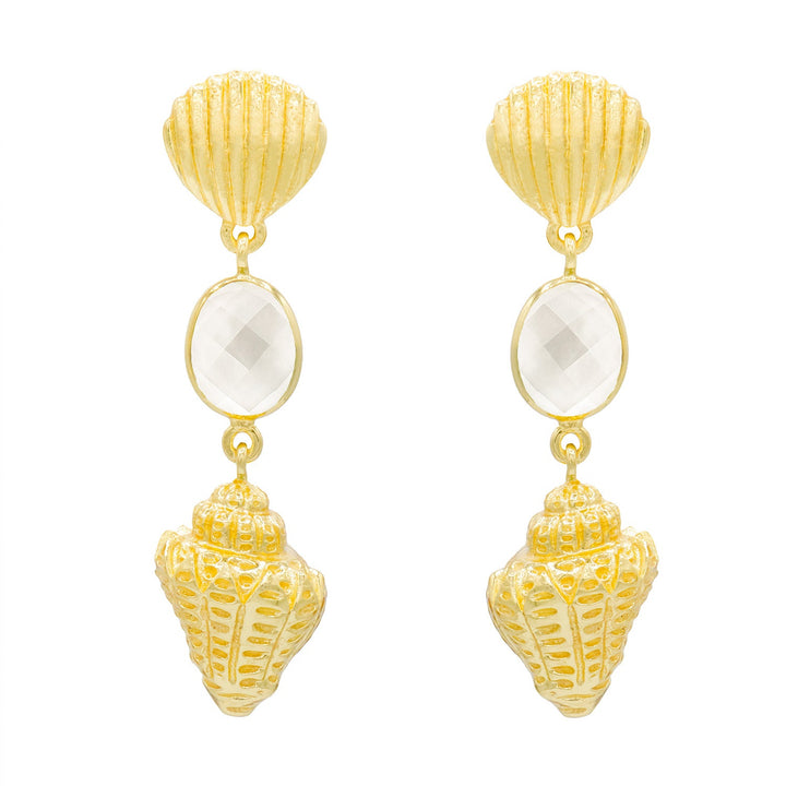 The Moray Earrings by Marcia Moran are fun and playful, featuring a 24k gold-plated seashell design with a gemstone attached in the middle. Measuring 2 inches, these earrings are perfect for adding a touch of the ocean to your look.