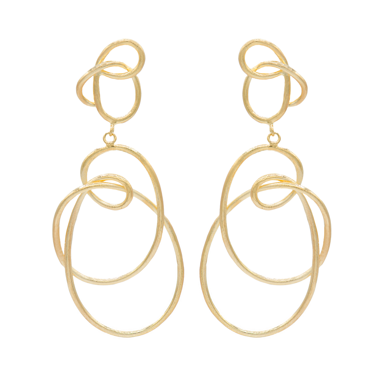 The Aster Earrings by Marcia Moran feature swirl knot details in 18k gold plating, creating a dynamic and sophisticated look. Measuring 3 inches, these shiny earrings are bold yet elegant. Handmade in Brazil, they showcase exceptional craftsmanship.