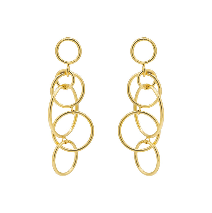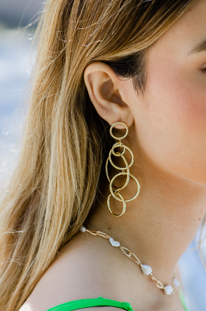 The Anica Earrings by Marcia Moran are 18k gold-plated statement earrings featuring shiny interlinked designs, offering a bold and elegant look. Measuring 3 inches long, these earrings are perfect for a dramatic statement. Handmade in Brazil.