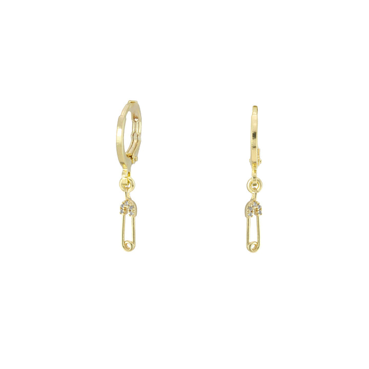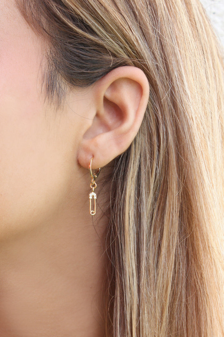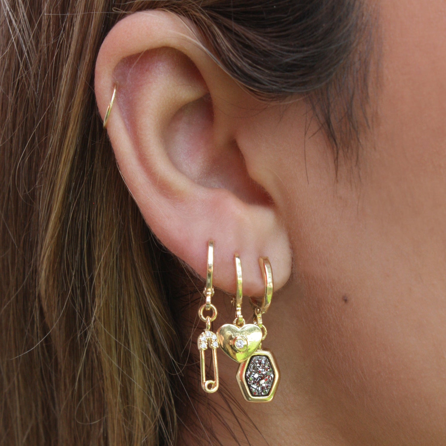 These CZ Safety Pin Charm Huggies by Marcia Moran feature a unique safety pin charm adorned with cubic zirconia, adding a touch of playful elegance to the huggie hoop style.