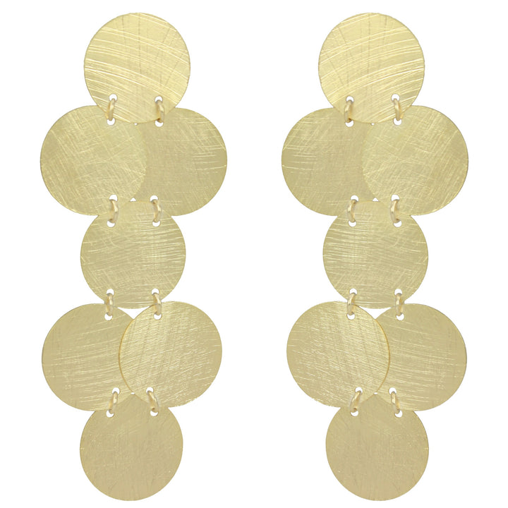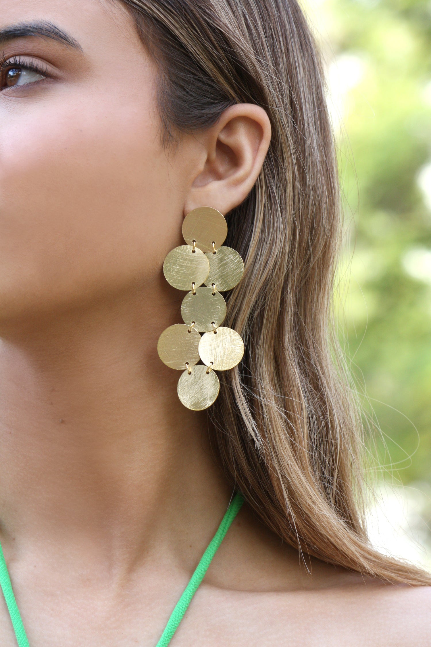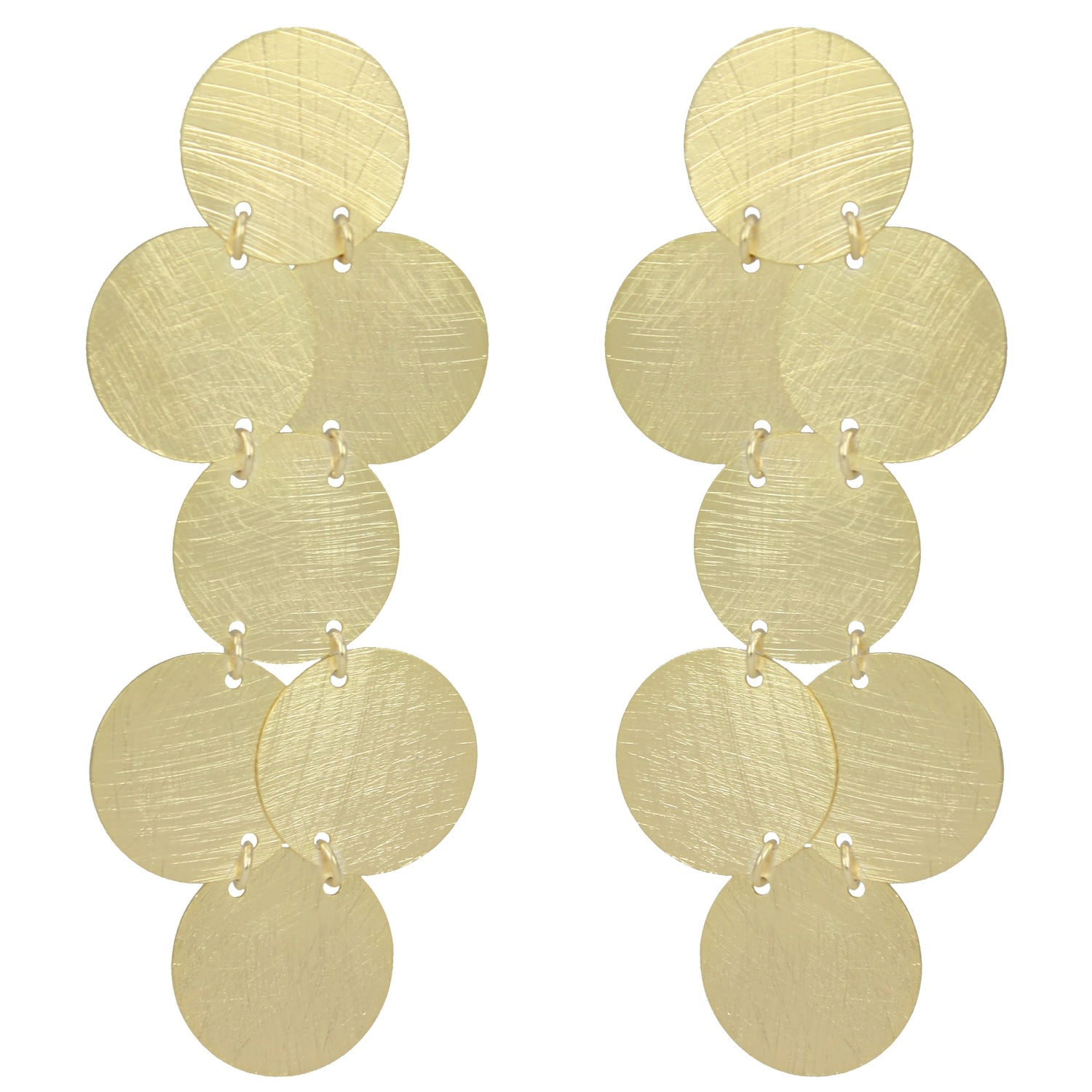 These Miss Statement Earrings by Marcia Moran are lightweight chandelier earrings with overlapping coins and a brushed gold texture, creating a bold statement. Perfect for adding a touch of glamour to any outfit.