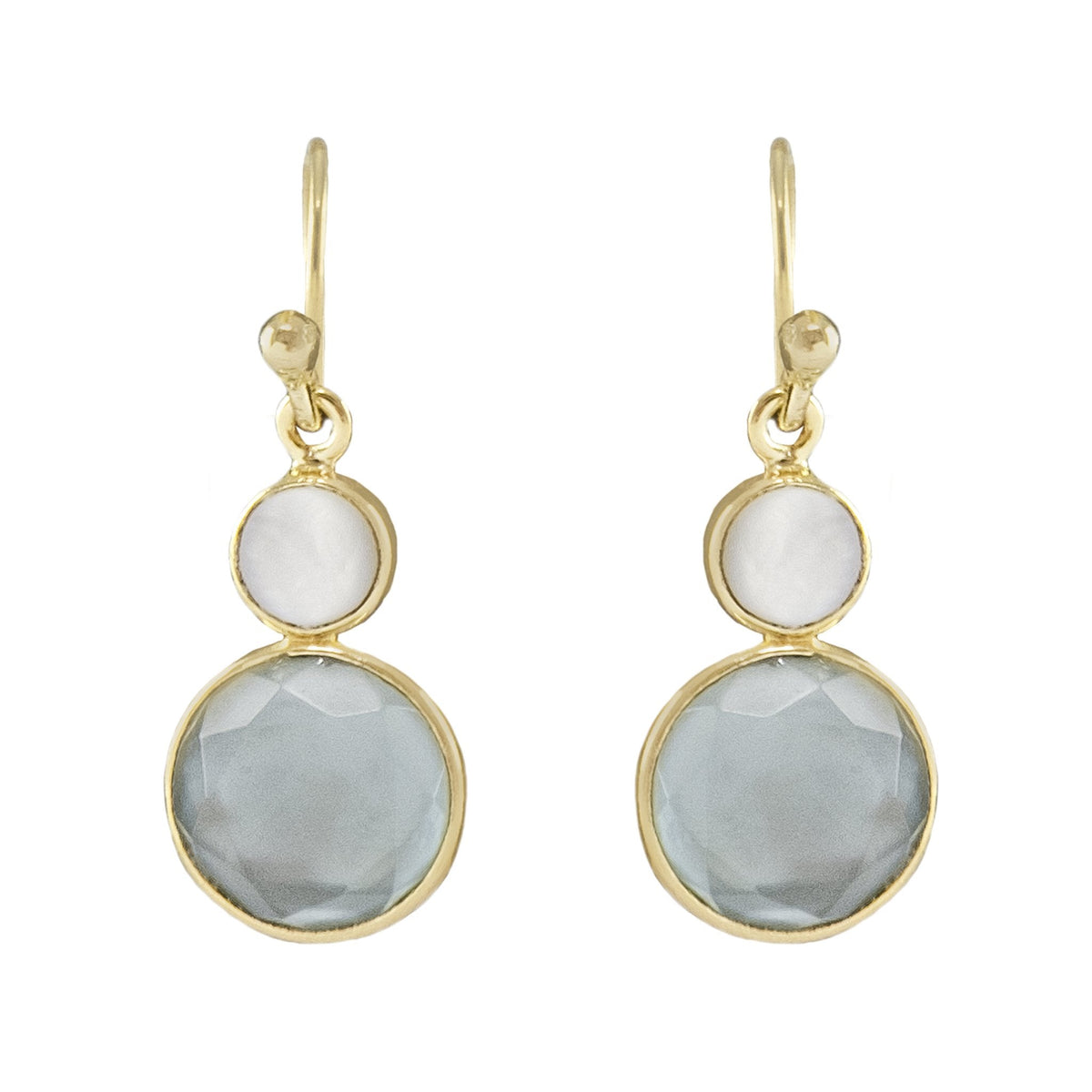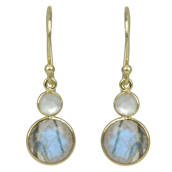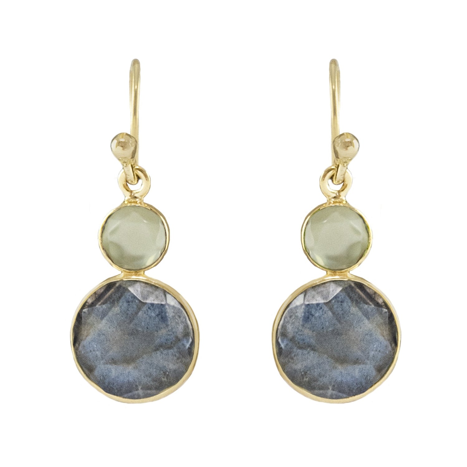 These Dena Round Stone Earrings by Marcia Moran feature two semi-precious stones in a round drop design, offering a natural and elegant look. Each stone varies in texture, shine, and color, adding individual character to the earrings.