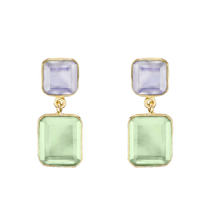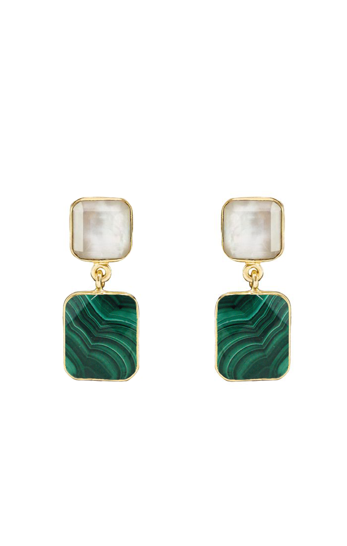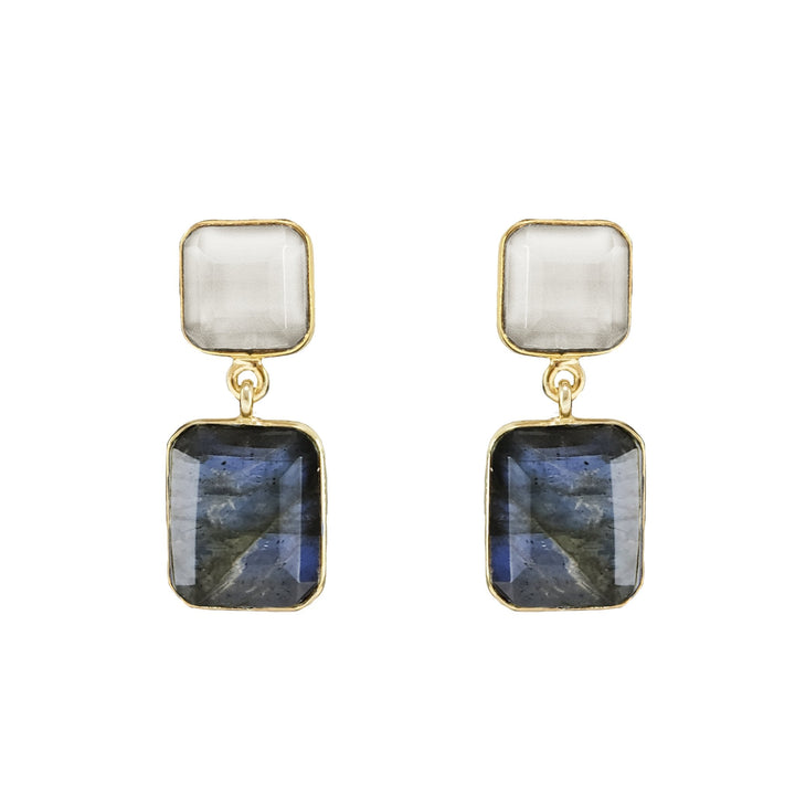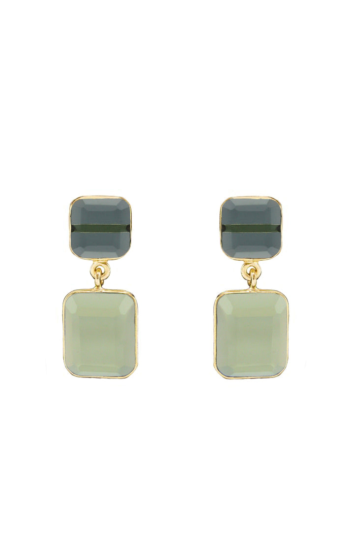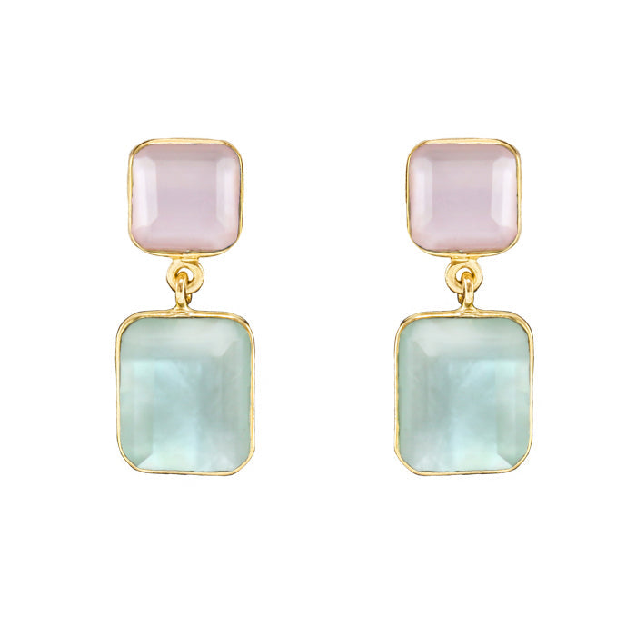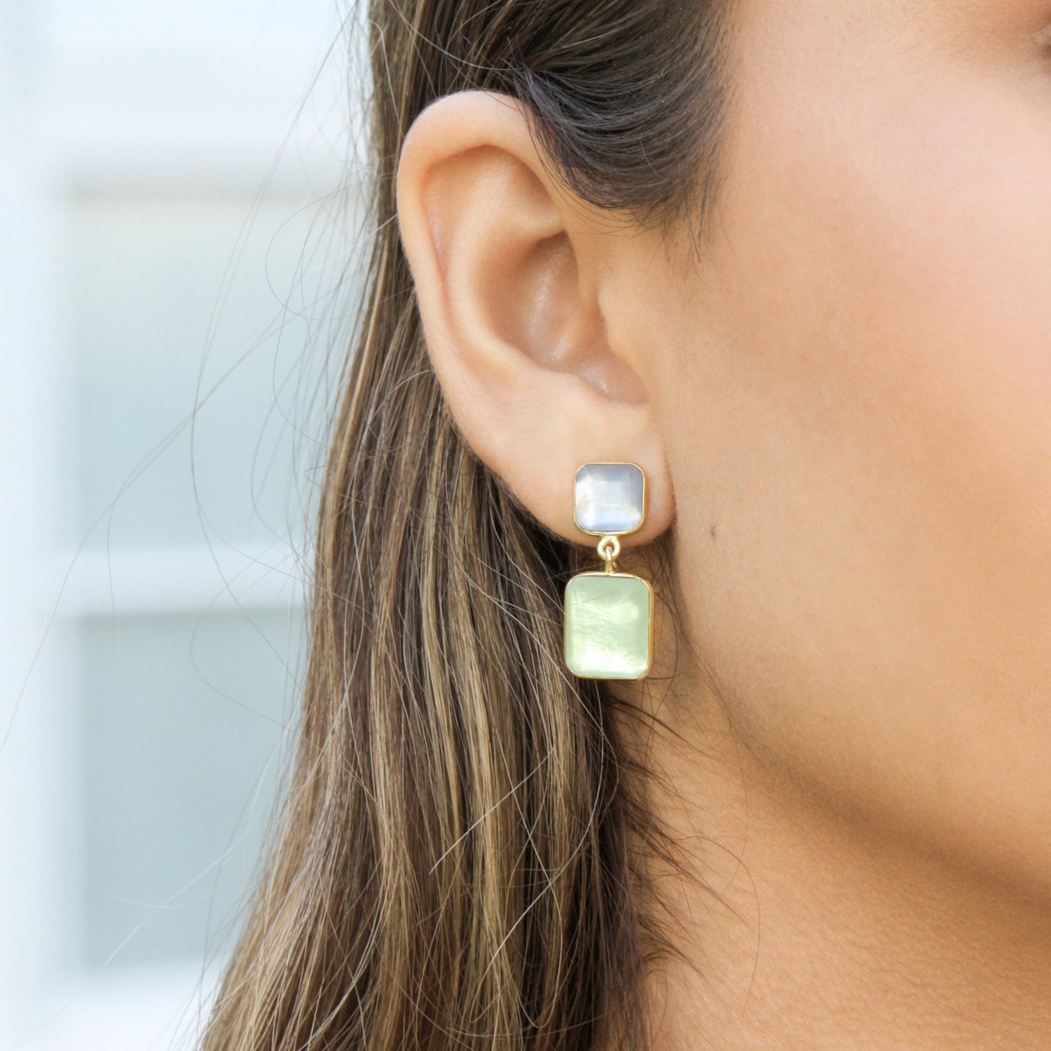 These Melva Stone Earrings by Marcia Moran offer a delicate two-tone rectangular design, perfect for adding a refined touch to any outfit. The natural semi-precious stones ensure each piece is unique.