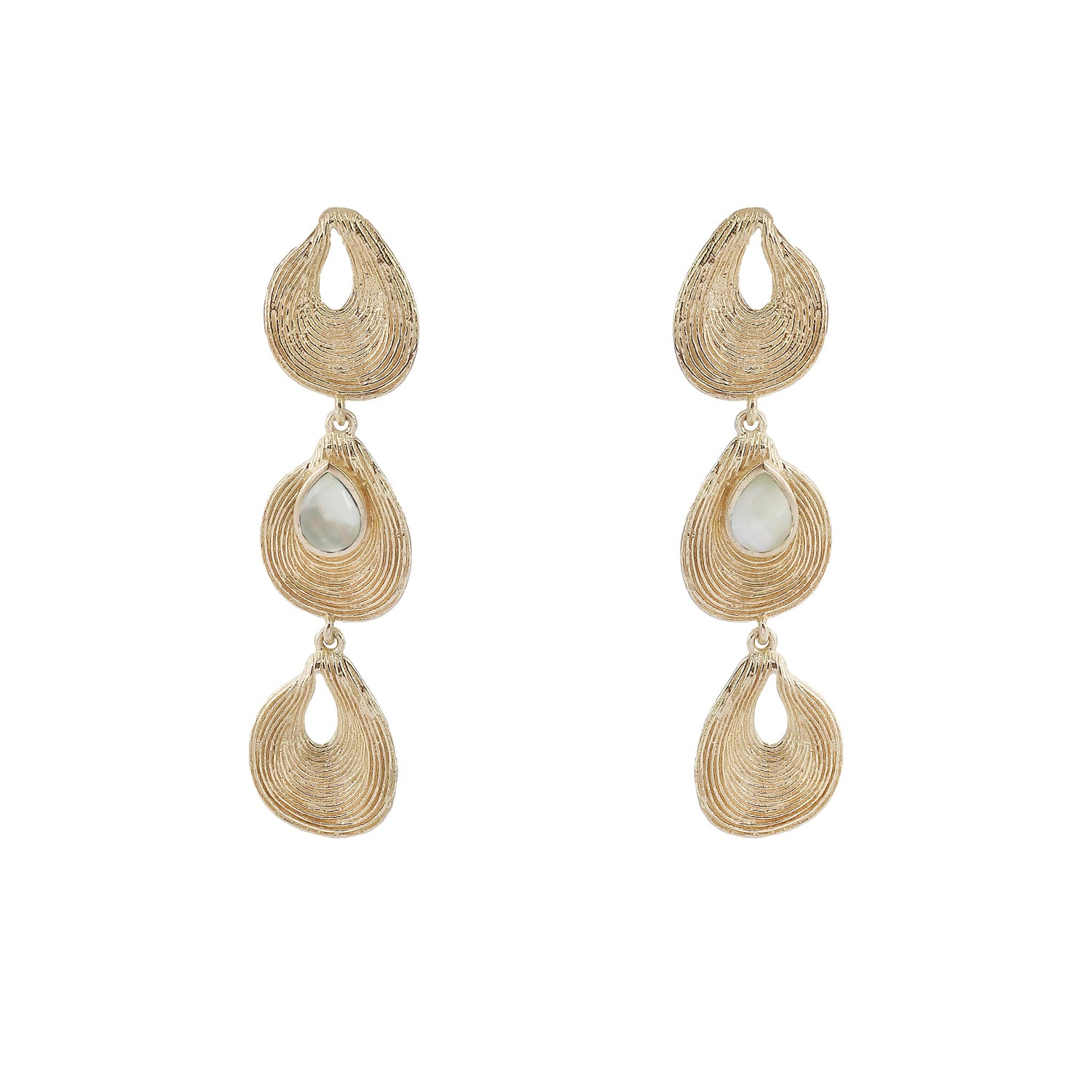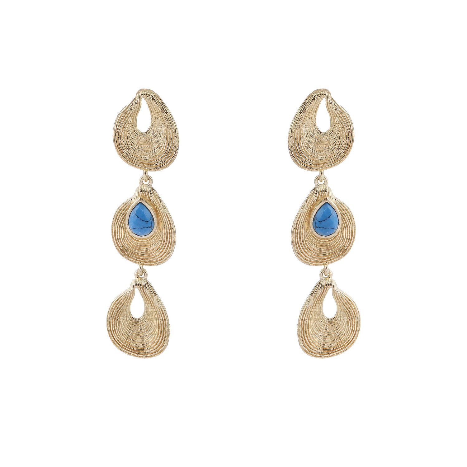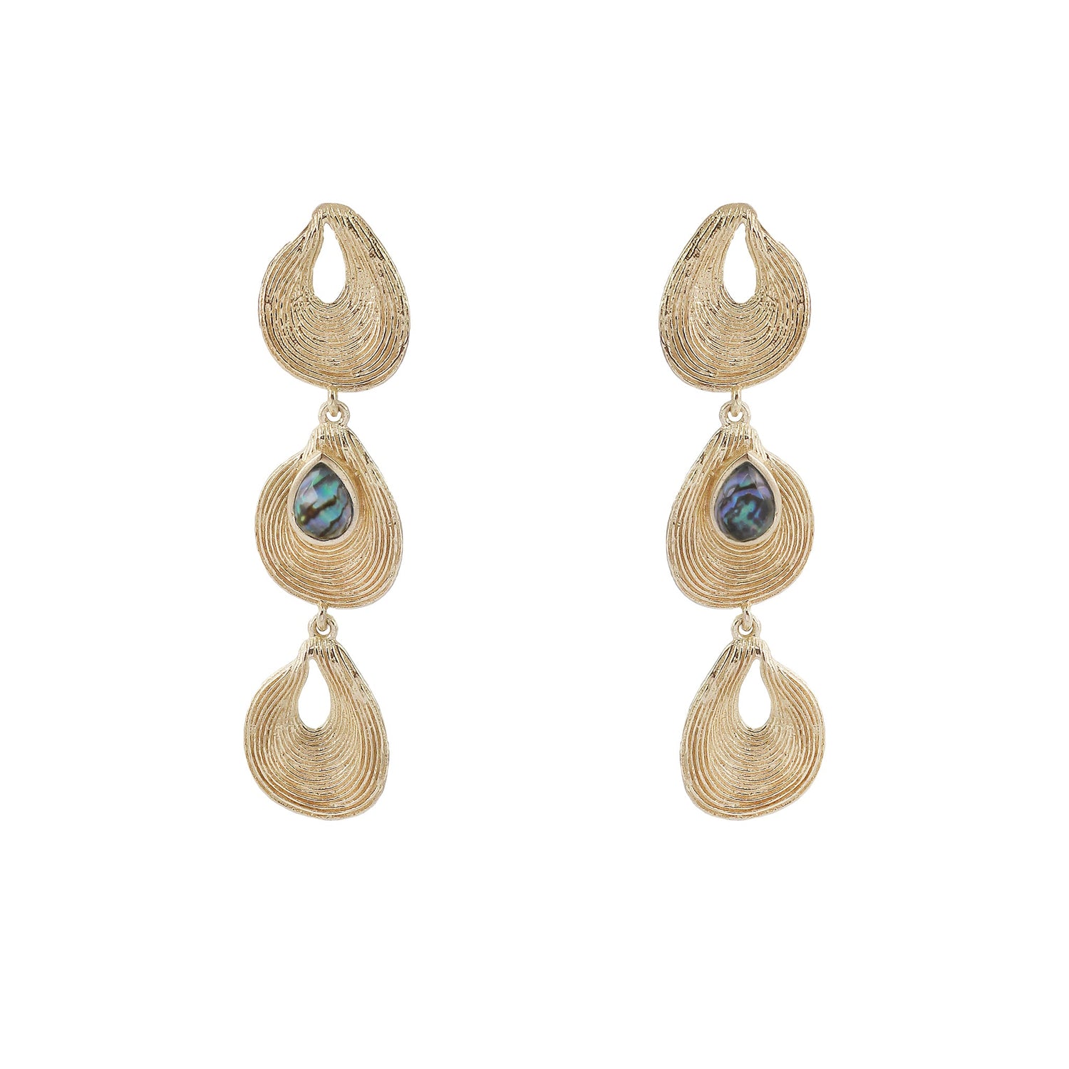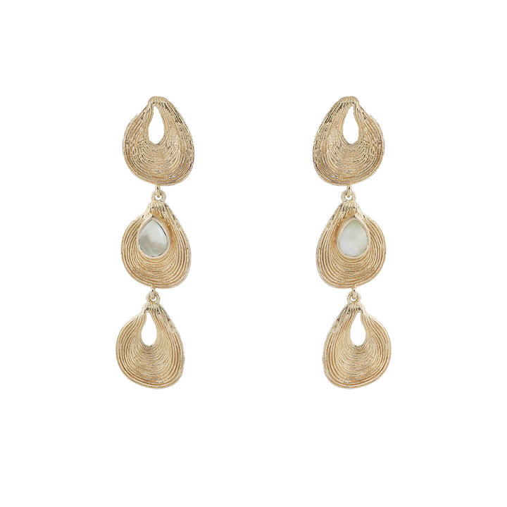 These Mabel Drop Earrings by Marcia Moran feature three textured drops and one stone, offering a modern yet organic aesthetic. Each pair showcases the uniqueness of natural semi-precious stones.