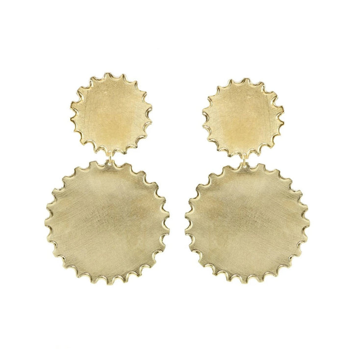 These Ilene Earrings by Marcia Moran feature round-shaped posts with fire-processed edges, adding a modern twist to a classic design. Their larger size makes them a bold accessory for any occasion.