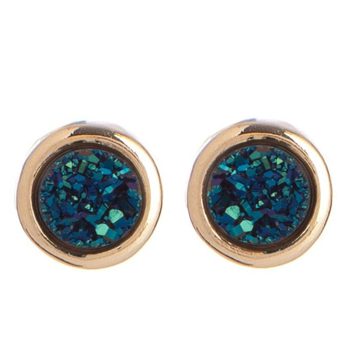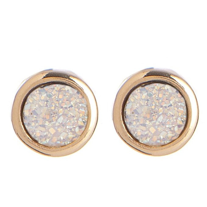 These Regis Round Stud Earrings by Marcia Moran feature a druzy stone set in a round stud design, offering a delicate yet elegant look. Their small size makes them perfect for everyday wear.