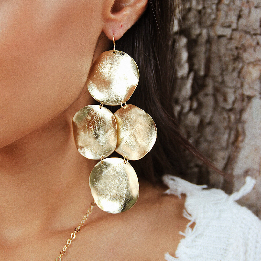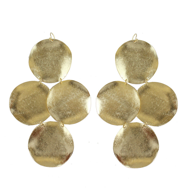 These Alexia Statement Coin Earrings by Marcia Moran are extra-large brushed chandelier earrings featuring interconnected circles, creating a dramatic and elegant statement piece. Their bold size and intricate design make them perfect for special occasions.