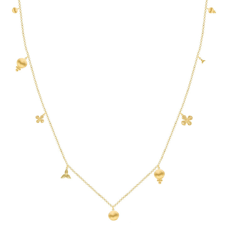 The Penny Long Necklace by Marcia Moran is an 18k gold plated piece featuring varying shaped charms along the chain, adding dynamic movement and versatility. Measuring 28 inches, it is ideal for layering and pairs beautifully with matching earrings for a coordinated look.