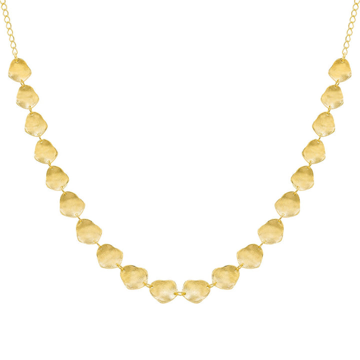 The Lua Necklace by Marcia Moran is an 18k gold plated piece with brushed organic petal shapes, offering a refined yet playful design. This necklace is perfect for both casual and formal occasions, adding a touch of sophistication to any outfit.