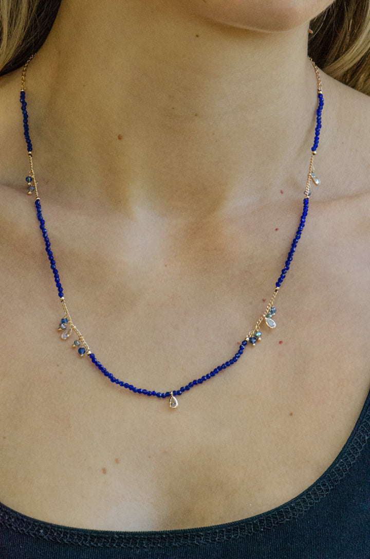 The Sirena Necklace by Marcia Moran features multicolor beads and cubic zirconia, creating a vibrant and stylish look. Its adjustable length makes it perfect for layering or wearing solo.
