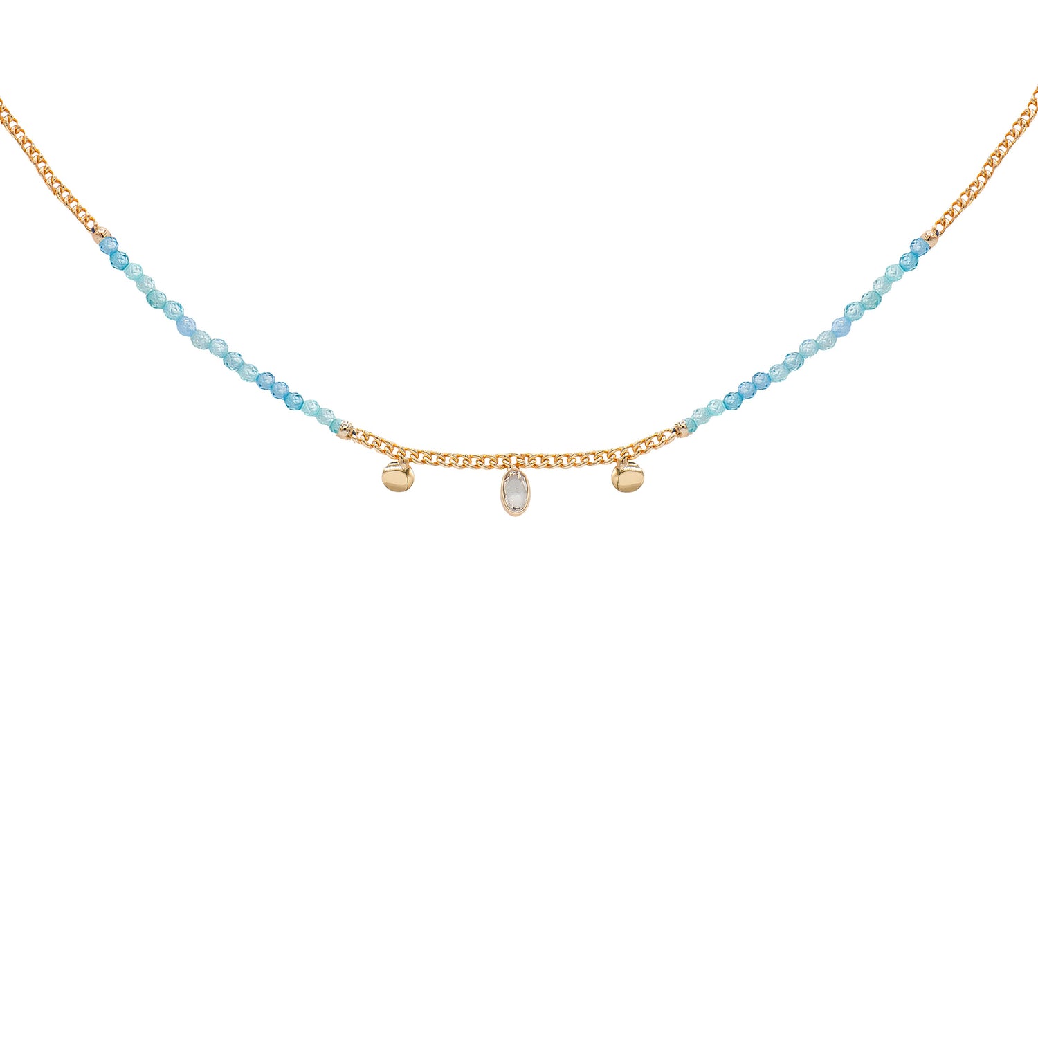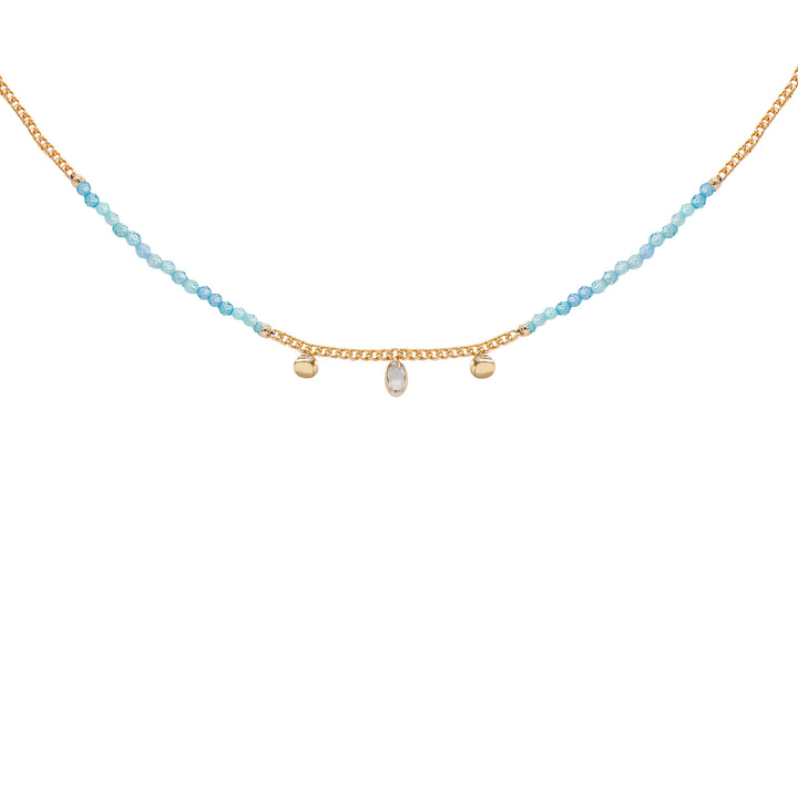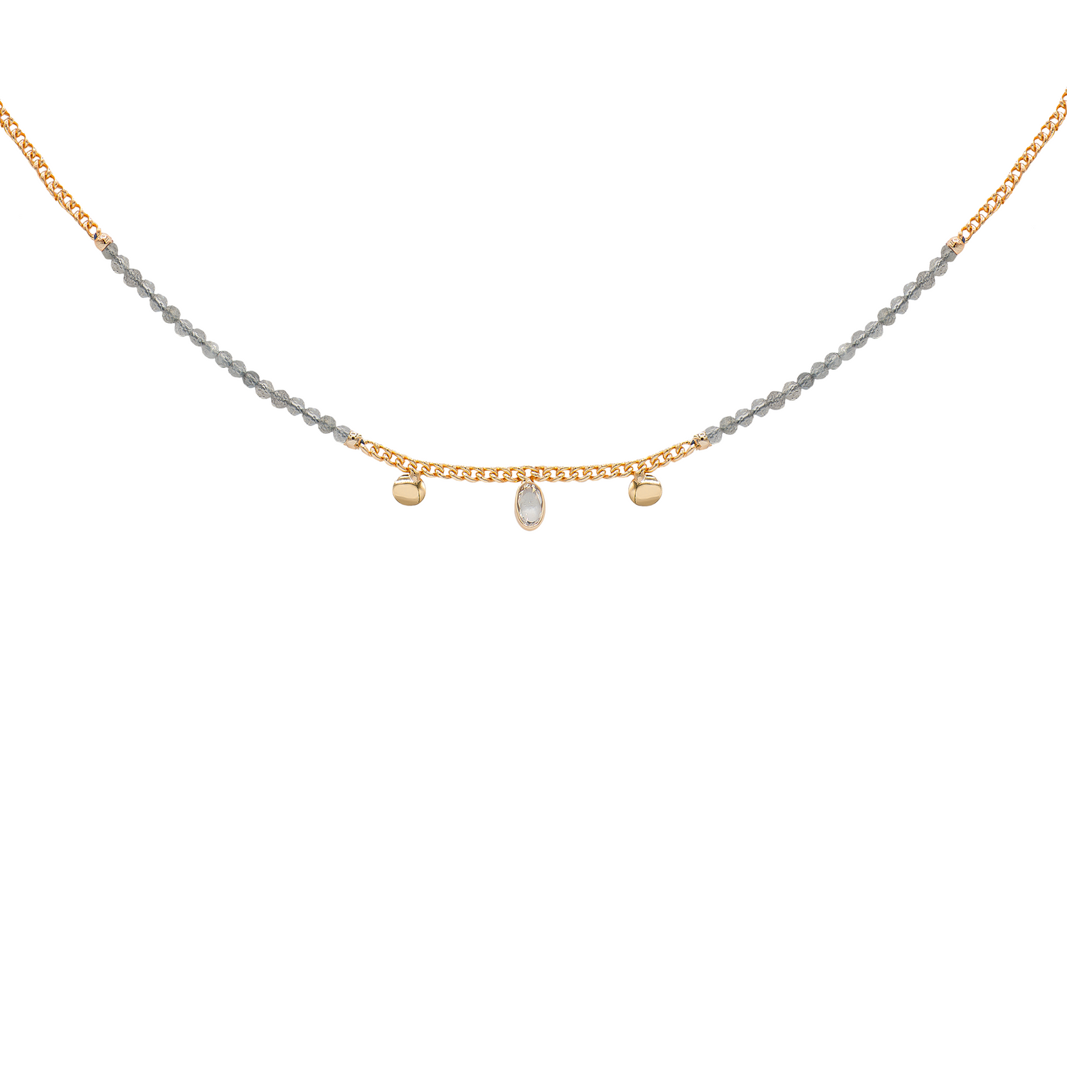 The Luella Necklace by Marcia Moran features beads and charms in a delicate 18k gold plated design. Its shorter length makes it perfect for layering, adding a refined and chic touch to any look.