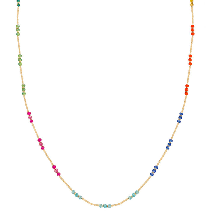 18k gold plated with multicolor crystal beads. Necklace measures 26 inches with a 2-inch extender. Handmade in Brazil.