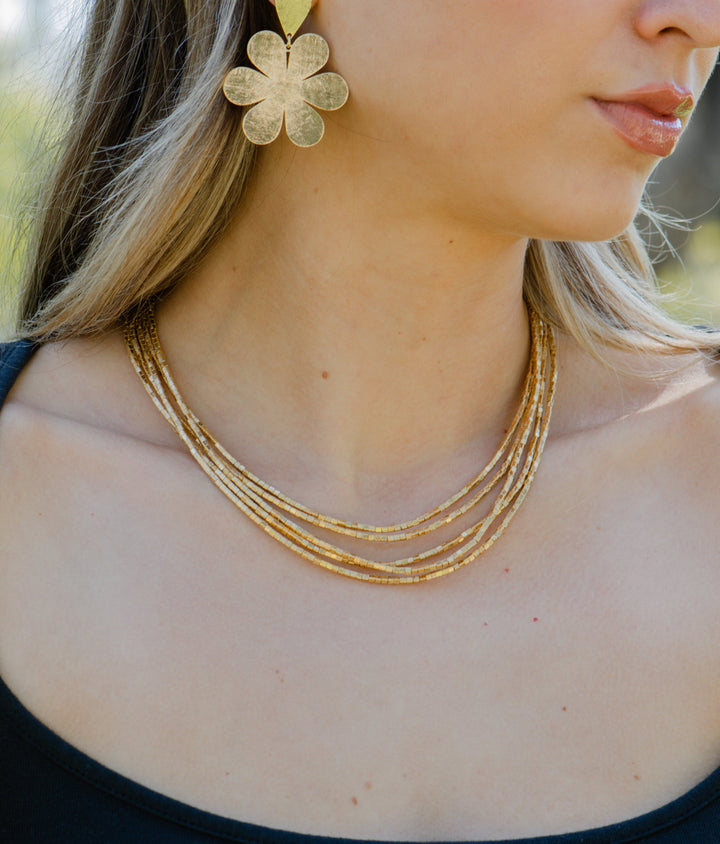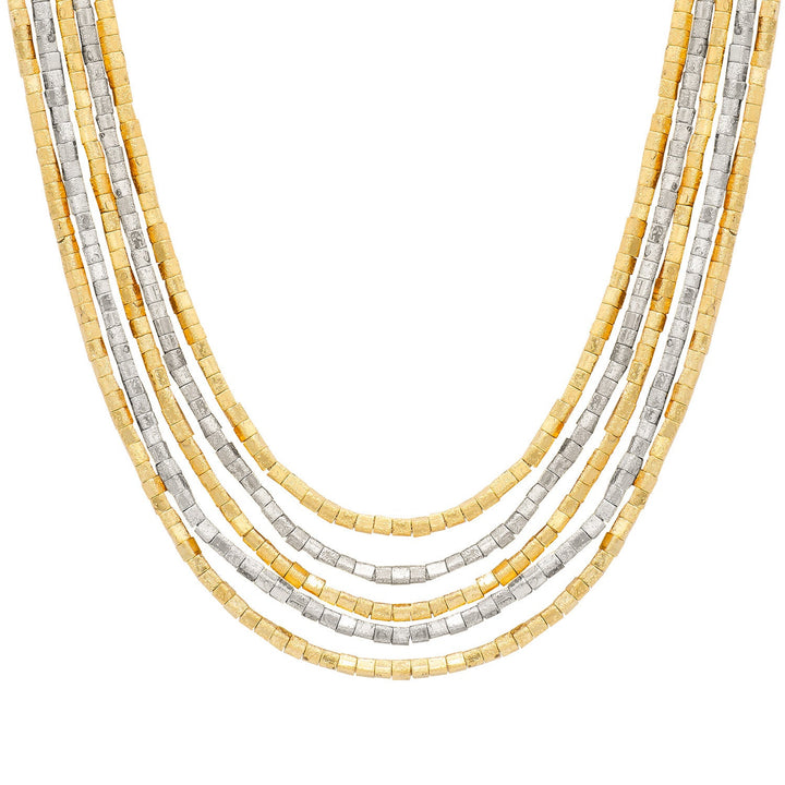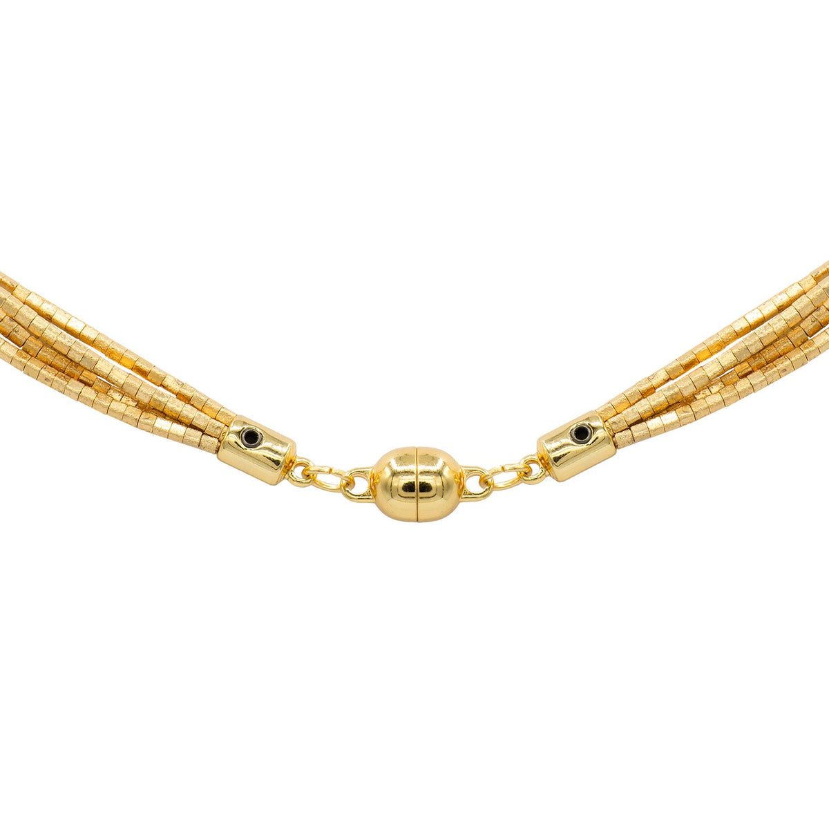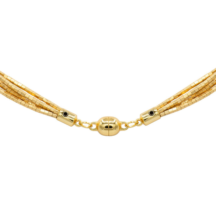The Amunet Beaded Necklace by Marcia Moran is a chic 18k gold plated piece with strands of tiny cubic beads and a magnetic closure. Its versatile design makes it perfect for everyday wear, offering a stylish yet understated vibe.