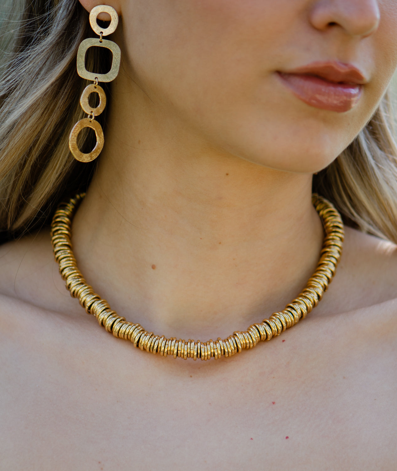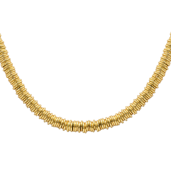 The Neve Necklace by Marcia Moran is an 18k gold and rhodium plated piece featuring thick gold jump rings and a magnetic closure. Its bold design adds a touch of luxury to any outfit.