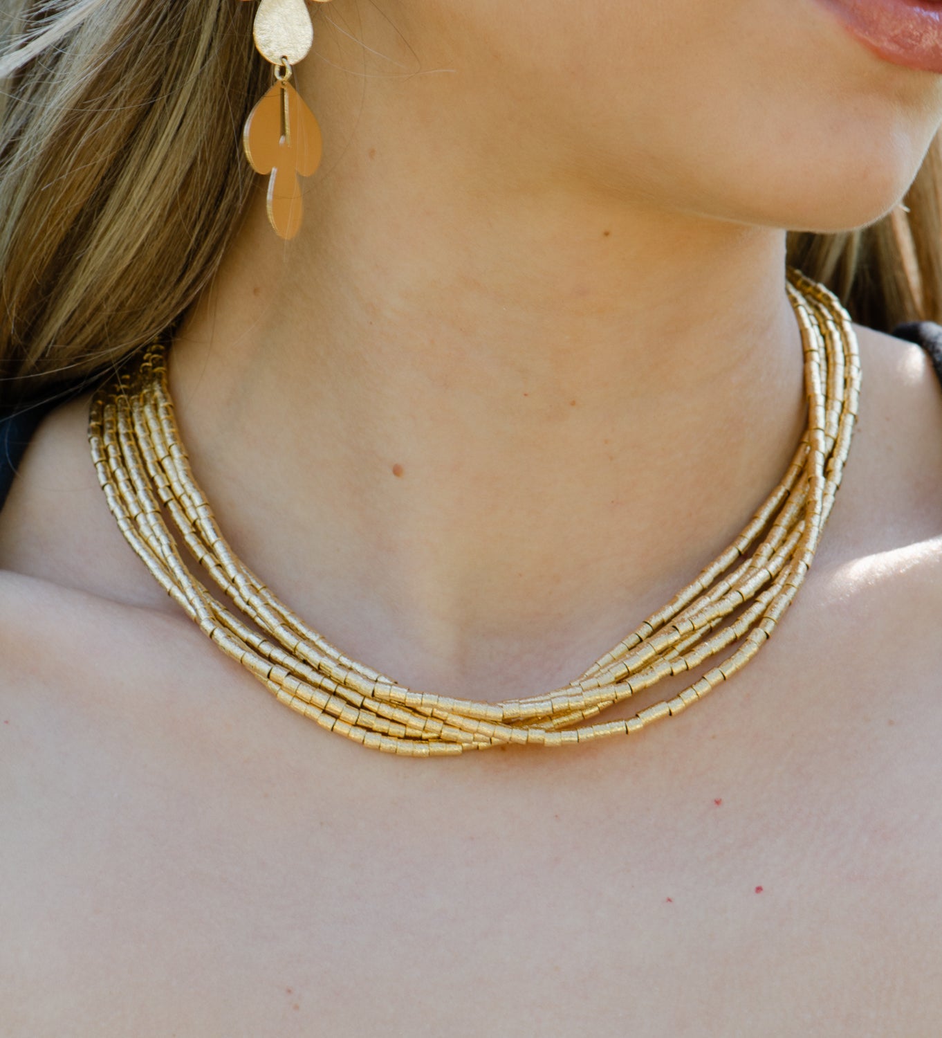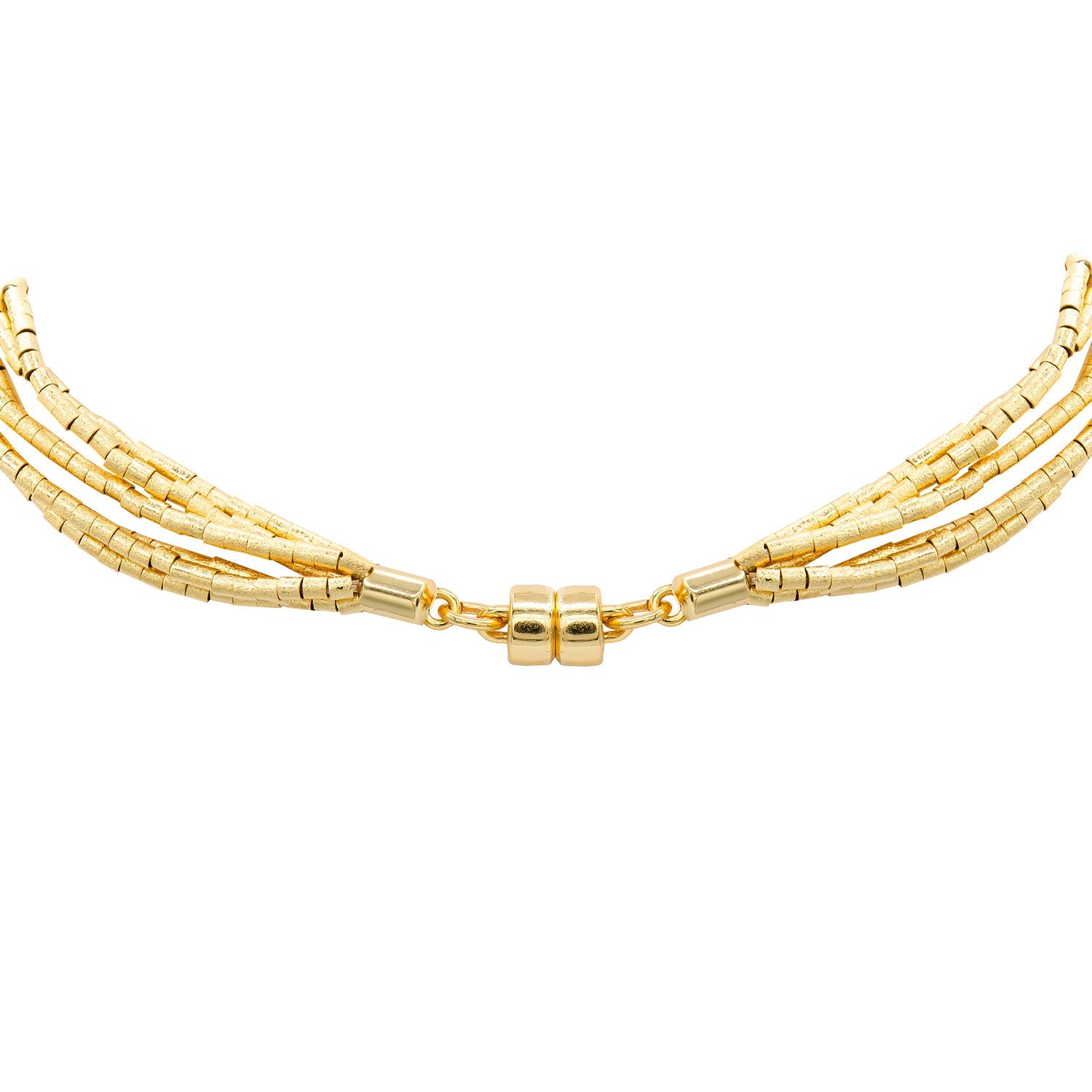 The Pasha Necklace by Marcia Moran features strands of small cylinder beads in an 18k gold plated design, offering a modern and elegant touch. Its magnetic closure ensures easy wear and adds a sleek, chic look to any outfit.