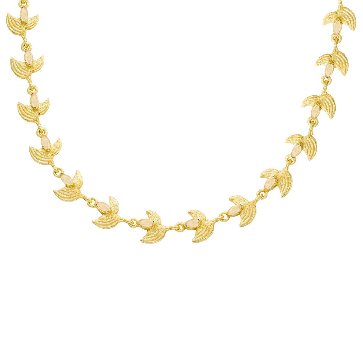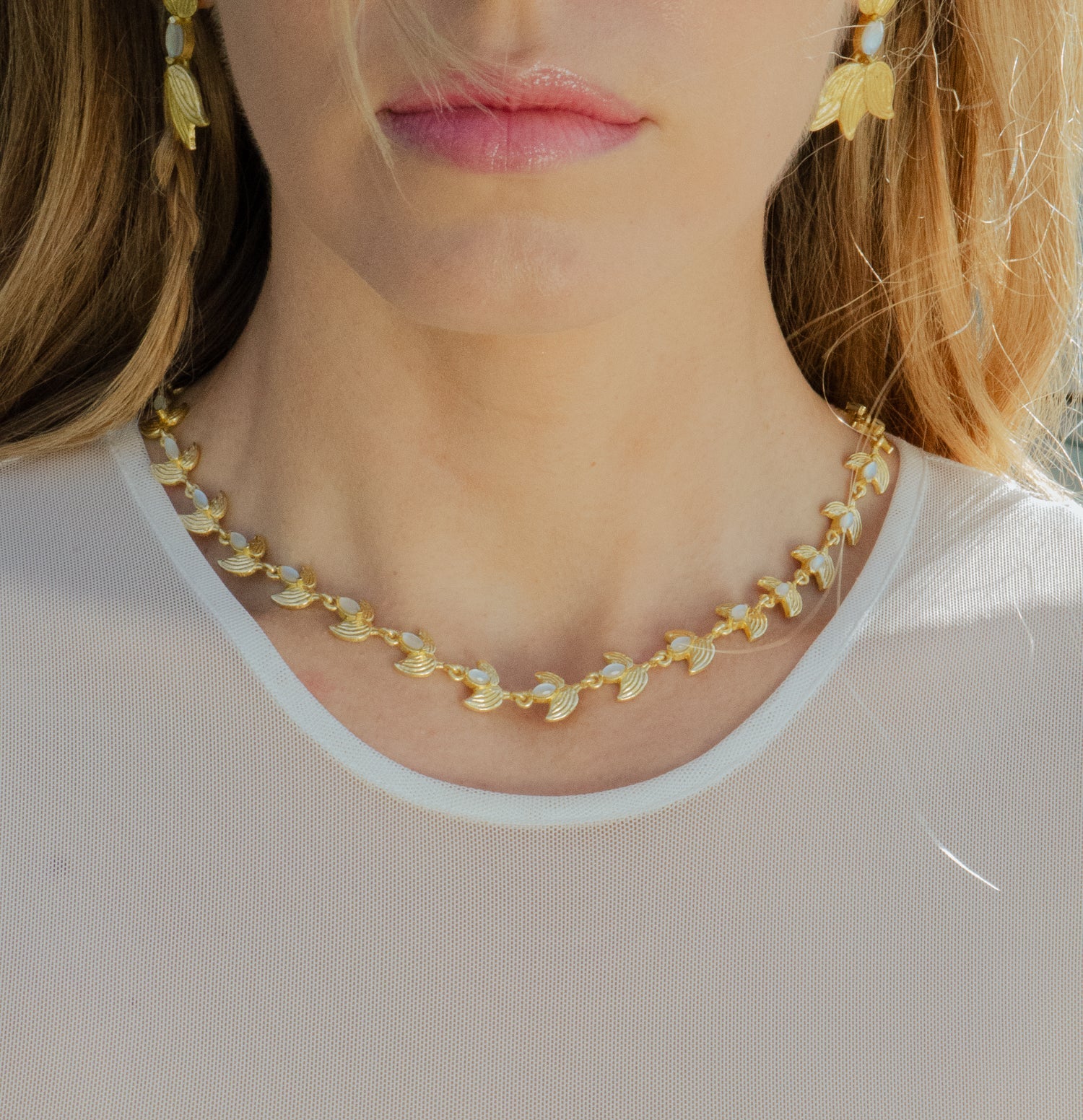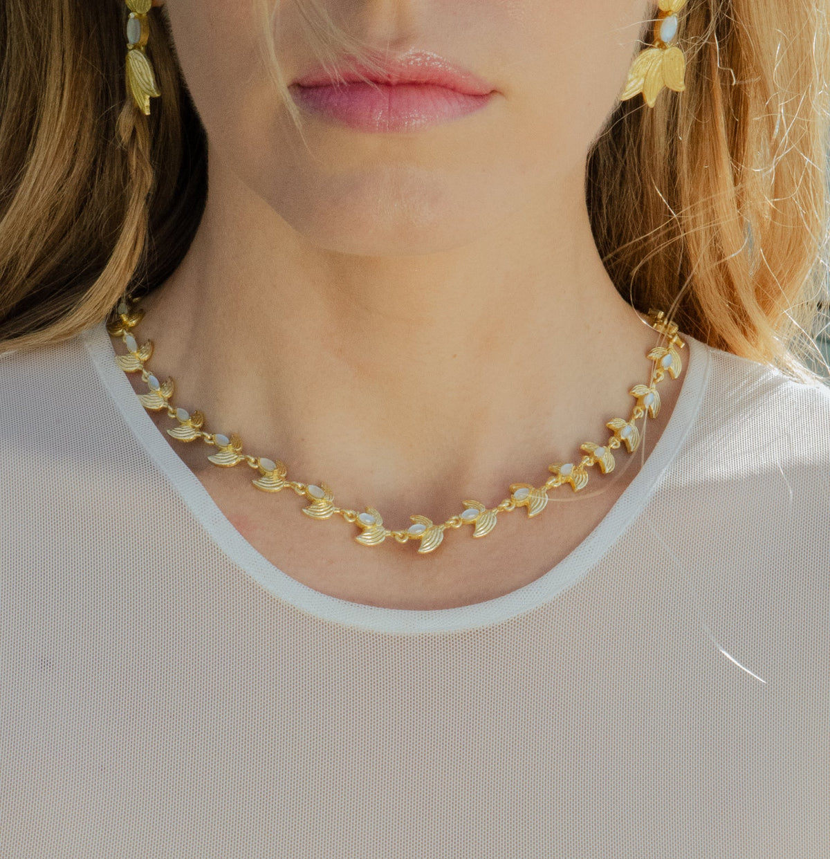 The Oria Necklace by Marcia Moran is a delicate 18k gold plated piece with clusters of leaves, each with a center gemstone, offering a nature-inspired and elegant design.
