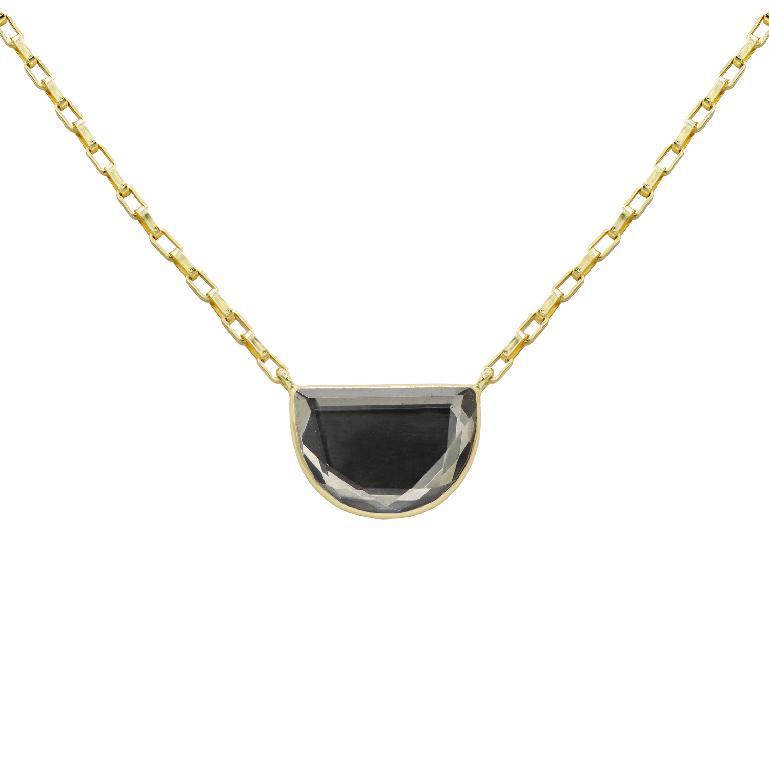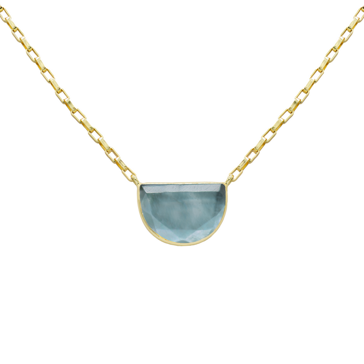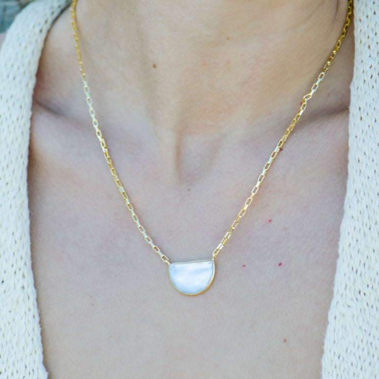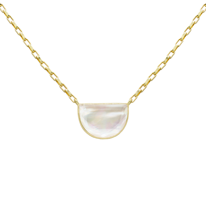 The Petaluma Necklace by Marcia Moran features a half-moon stone pendant, offering a chic and elegant look. Its 18k gold plating and adjustable length make it a versatile addition to any outfit.