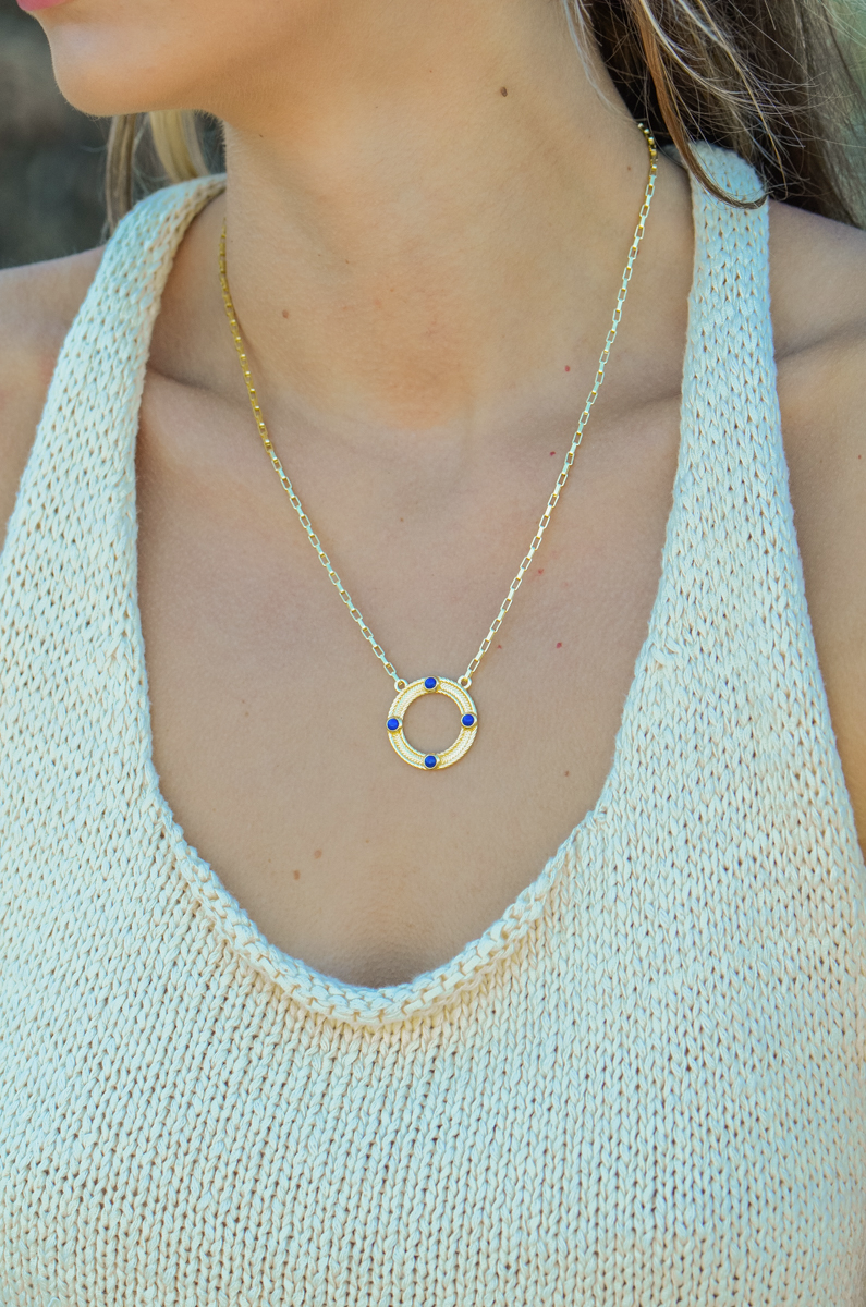 The Aspen Open Circle Necklace with Gemstones by Marcia Moran features an open circle pendant adorned with gemstones, adding a pop of color and elegance. Available in Pearl, Green Onyx, Lapis, and Tanzanite.
