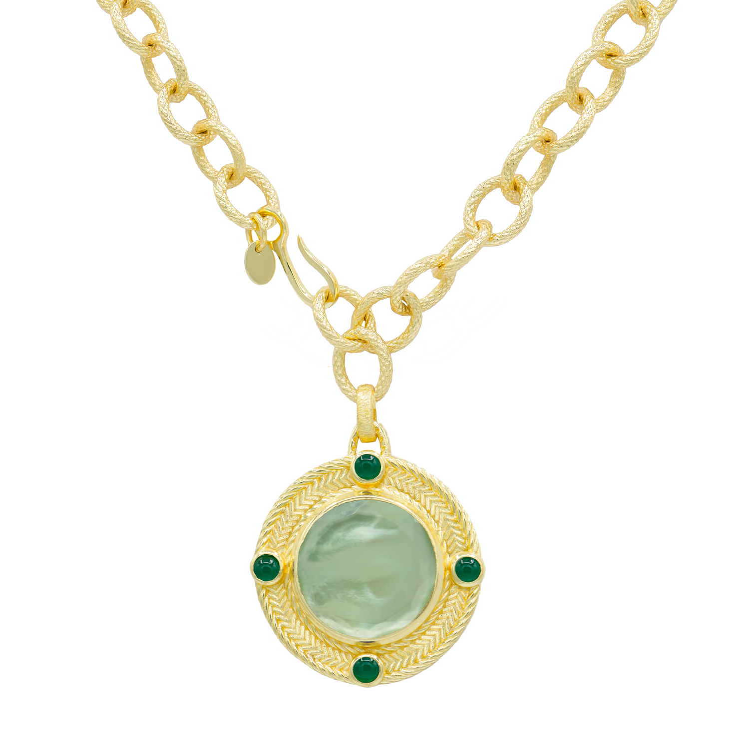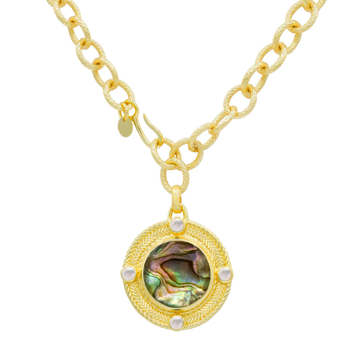 The Vail Statement Round Pendant by Marcia Moran features a large medallion pendant on a handmade organic chain, offering a bold and captivating design. Available in Mother of Pearl, Blue Sapphire, Morganite, Abalone, and Green Amethyst.