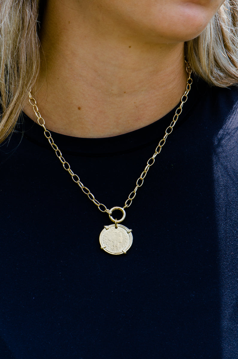 The Novalie Necklace by Marcia Moran features a vintage coin pendant, offering a timeless and classic design. This 18k gold plated piece adds a touch of elegance to any outfit and is perfect for layering.