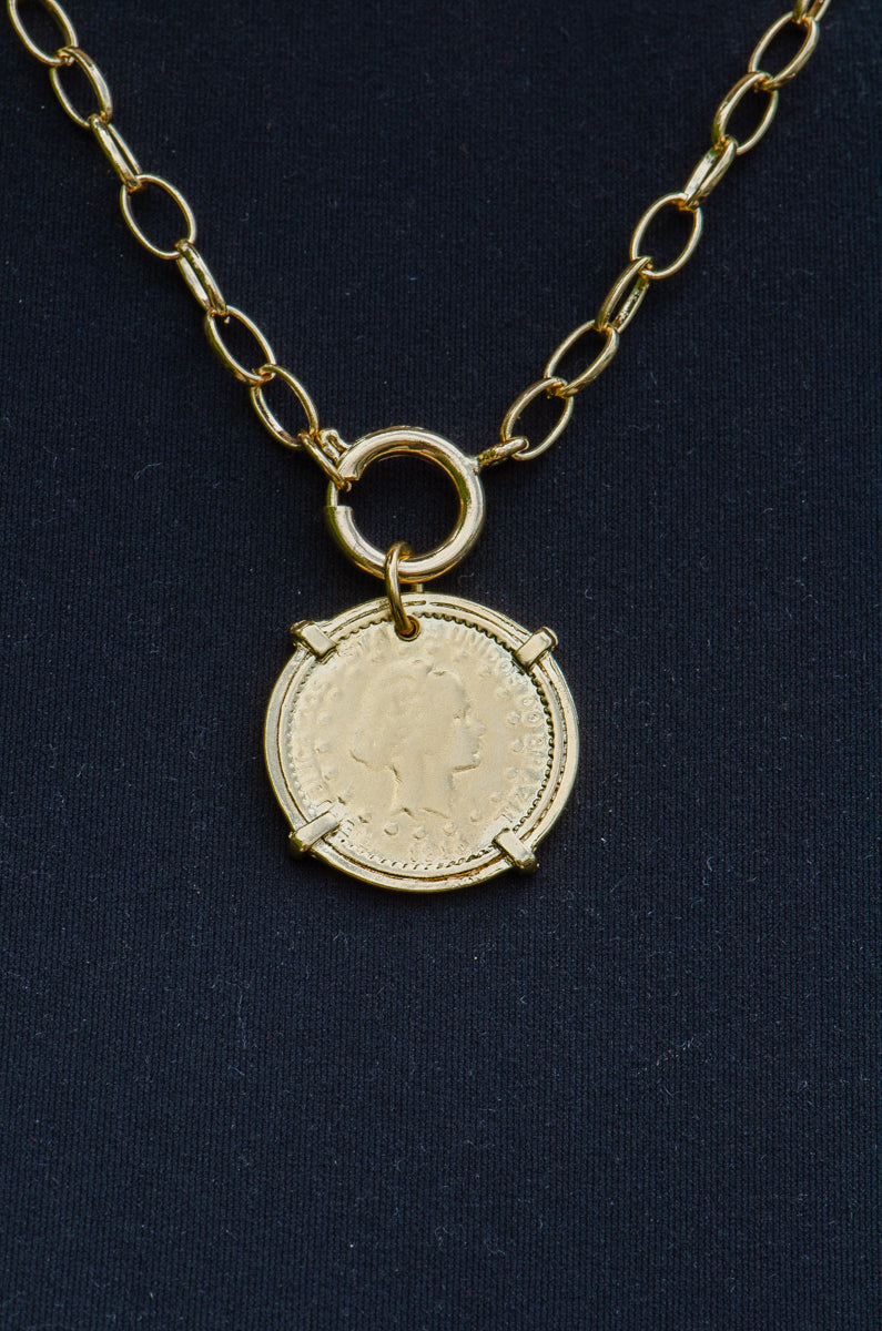 18k gold plated with vintage coin pendant. Necklace measures 16 inches. Handmade in Brazil.
