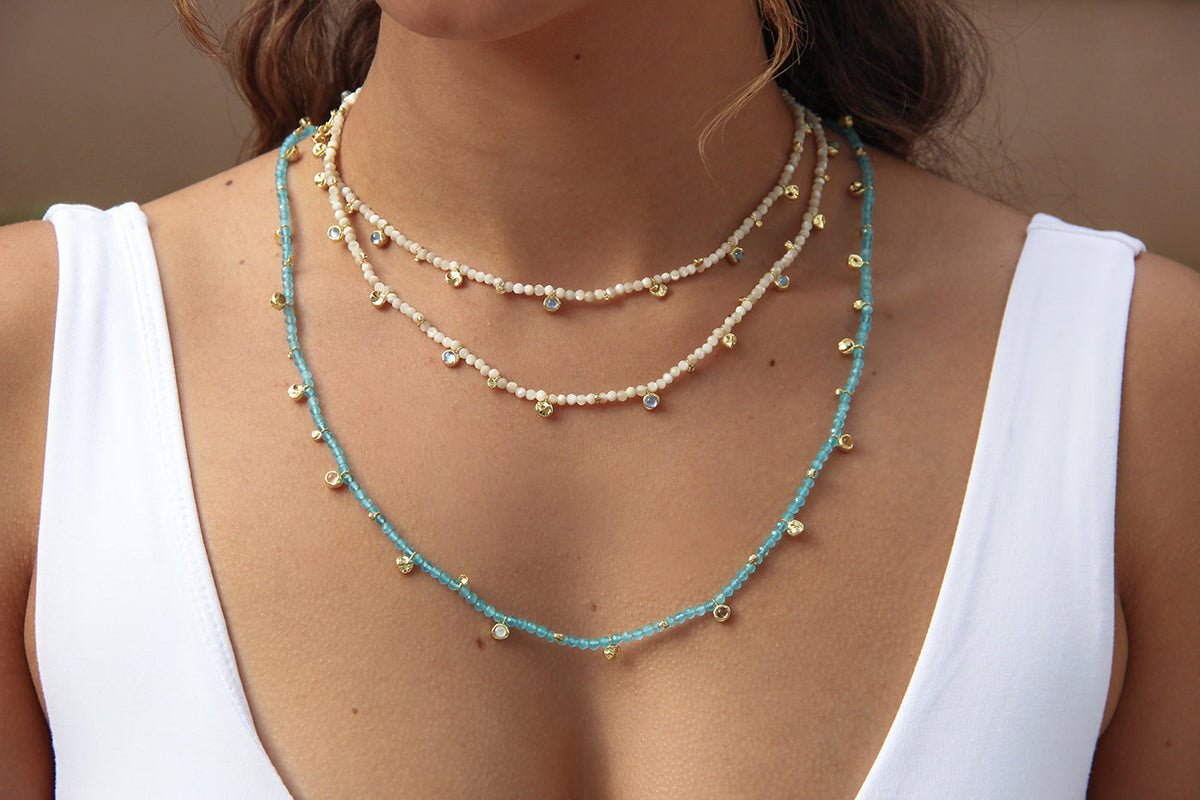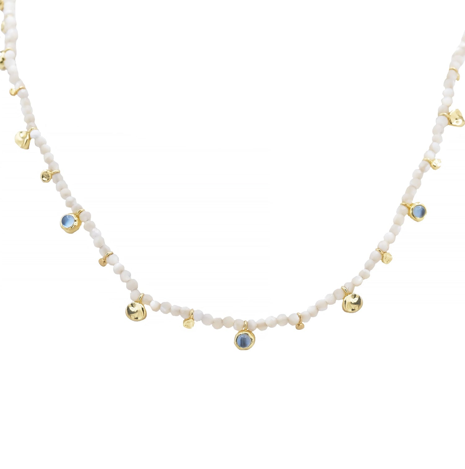 The Maura Necklace by Marcia Moran features beaded details with molten coins and small stone accents, offering a dynamic and playful design. Perfect for adding a unique touch to any outfit.