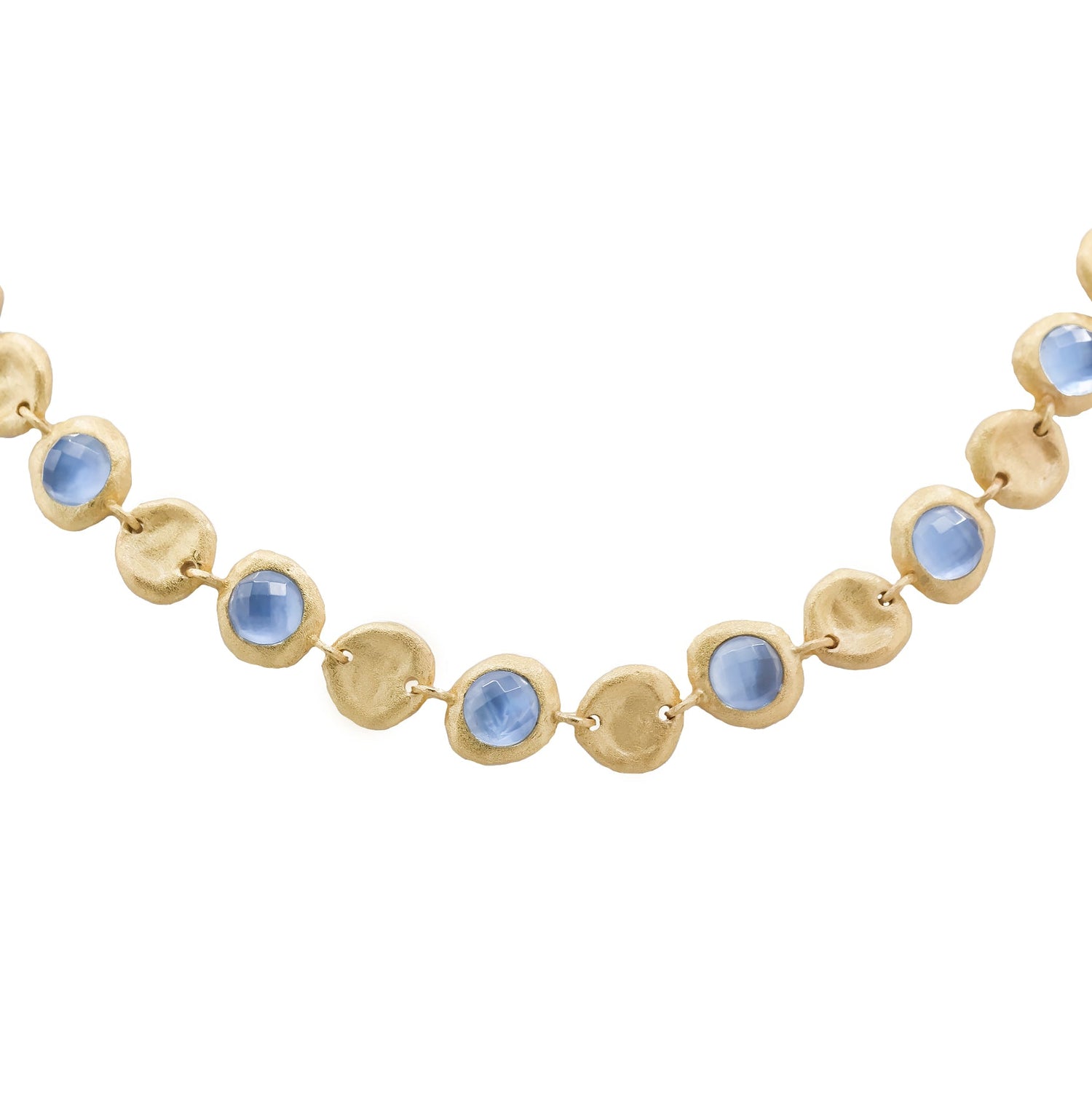 The Marylyn Necklace by Marcia Moran is a stylish piece featuring molten gold coins and multiple round stones, creating a playful and sophisticated aesthetic.