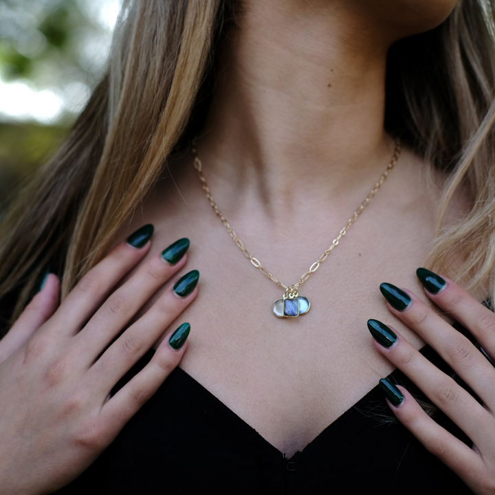 18k gold plated with three drop stones. Necklace measures 17 inches. Handmade in Brazil. Please note that our brand uses natural semi-precious stones, each with unique texture, shine, and color.
