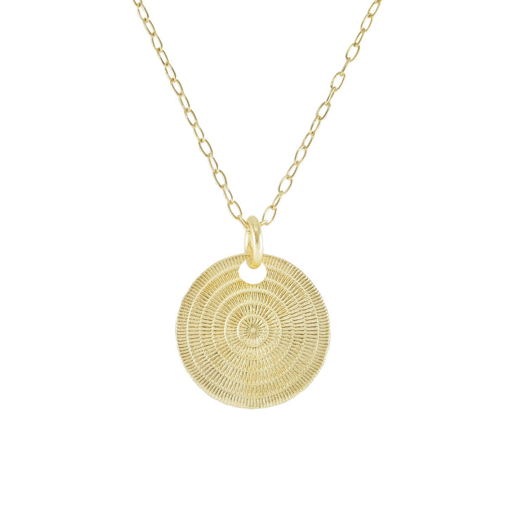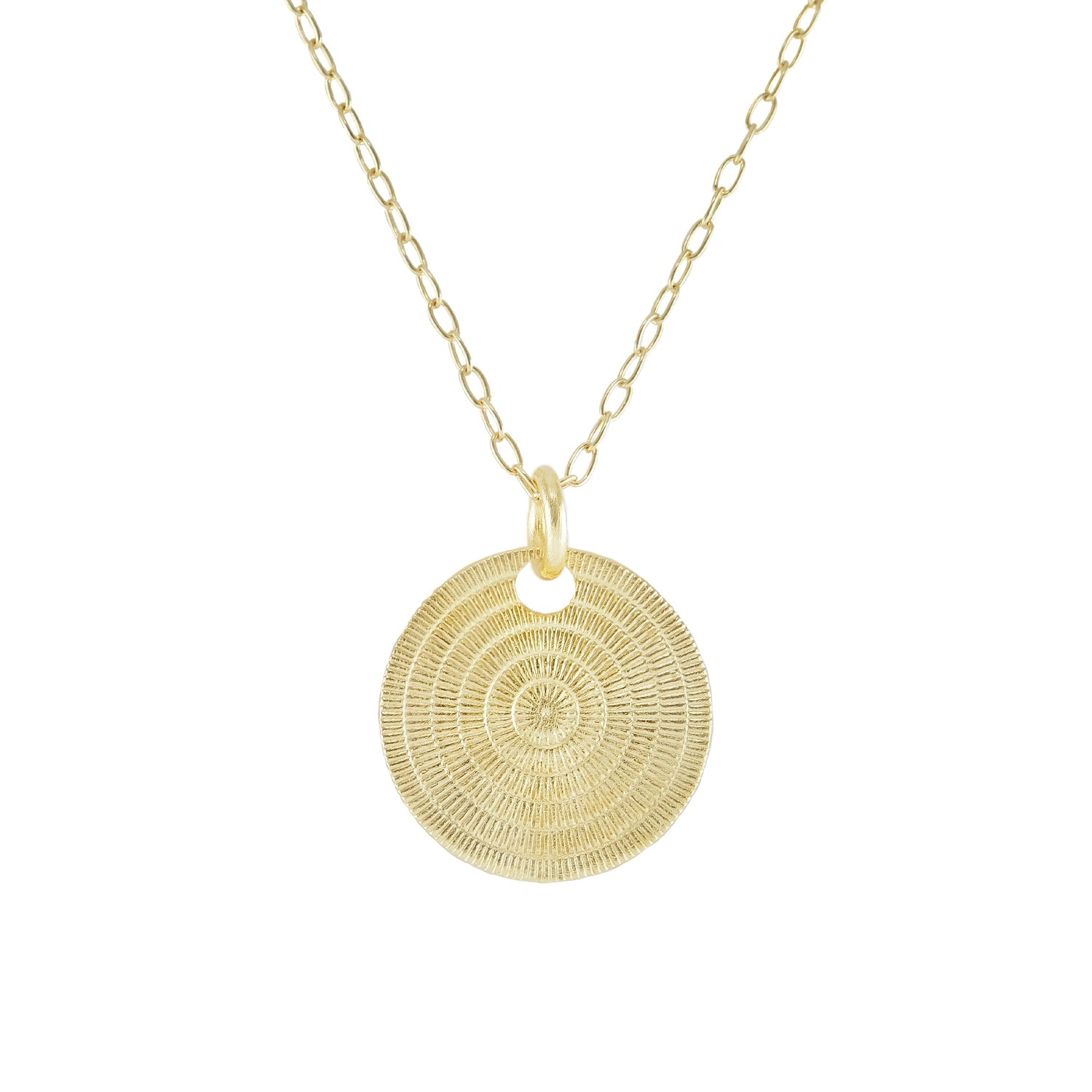 The Dulce Coin Necklace by Marcia Moran features a coin pendant with a sun-ray texture, adding a chic and modern flair to your look.
