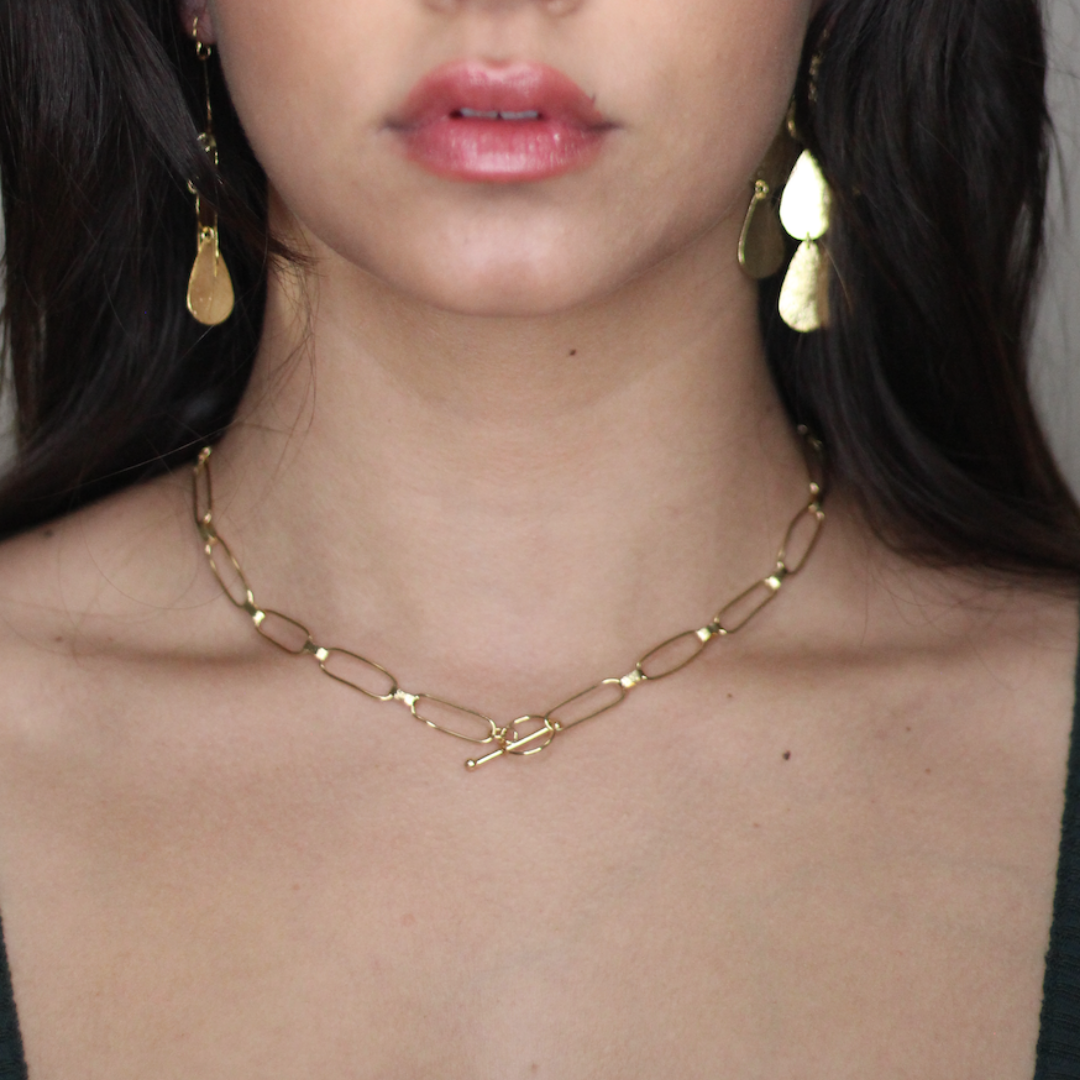 18k gold plated with large paper links and T-bar closure. Measures 17 inches. Handmade in Brazil.