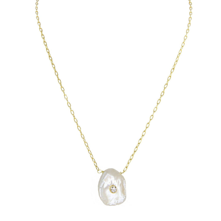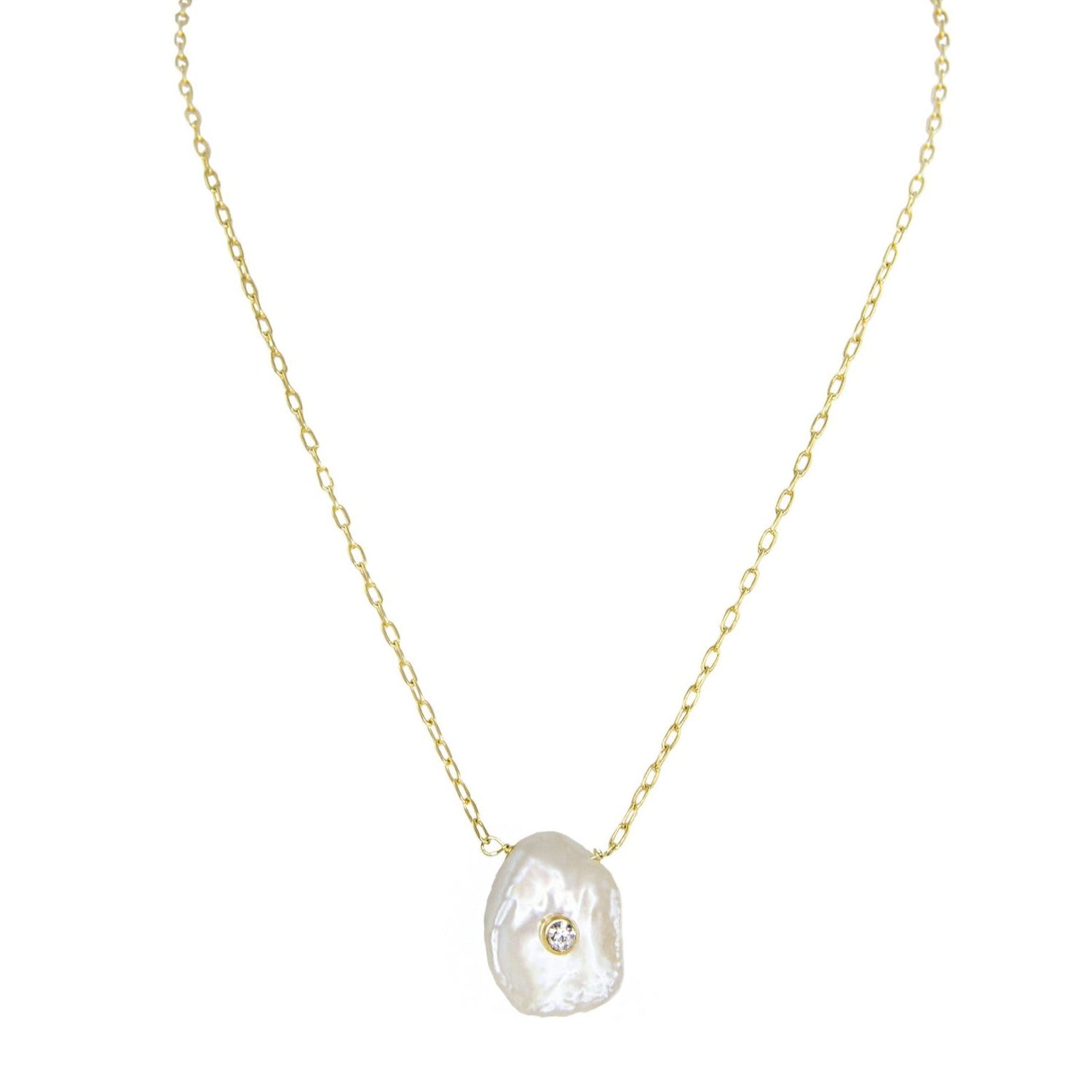 18k gold plated with a baroque pearl and CZ. Measures 18'. Handmade in Brazil.