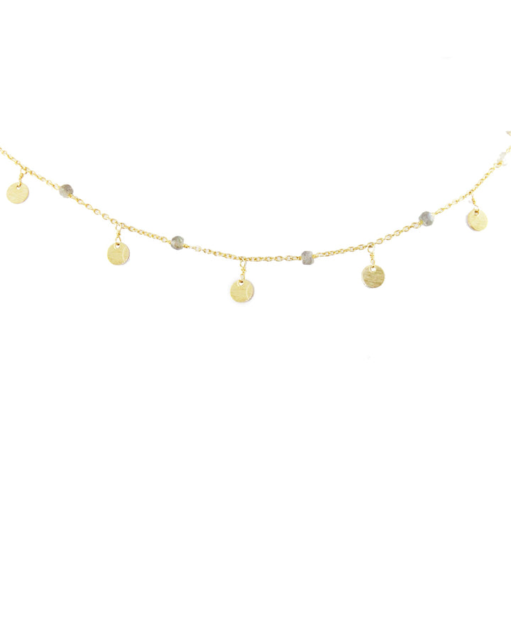 The Billie Beaded Short Necklace by Marcia Moran brings together natural stone beads and gold-plated coins, creating an effortlessly chic look.