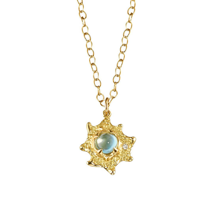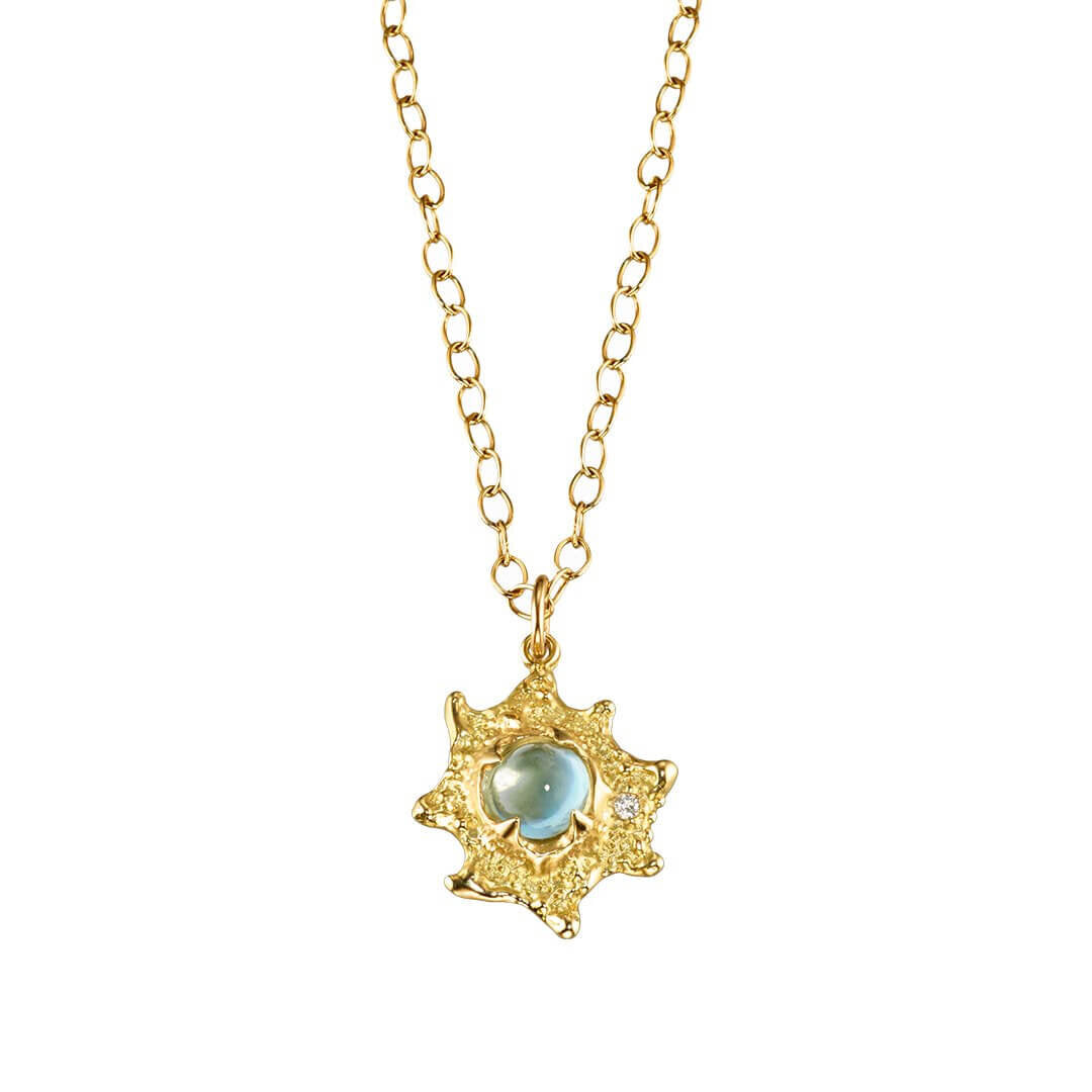 The Ocean collection is a deep dive into Jane's passion for marine life, inspired by the exotic colors and textures of shells and sea urchins. Organic forms with the playful palettes of assorted gemstones, each design has the vibrancy and warmth of a tropical reef. This 18k gold textured pendant set with a luminous blue aquamarine cabochon and a white diamond dangles on an 18k gold chain. This starry little sea creature will keep the ocean close to your heart.