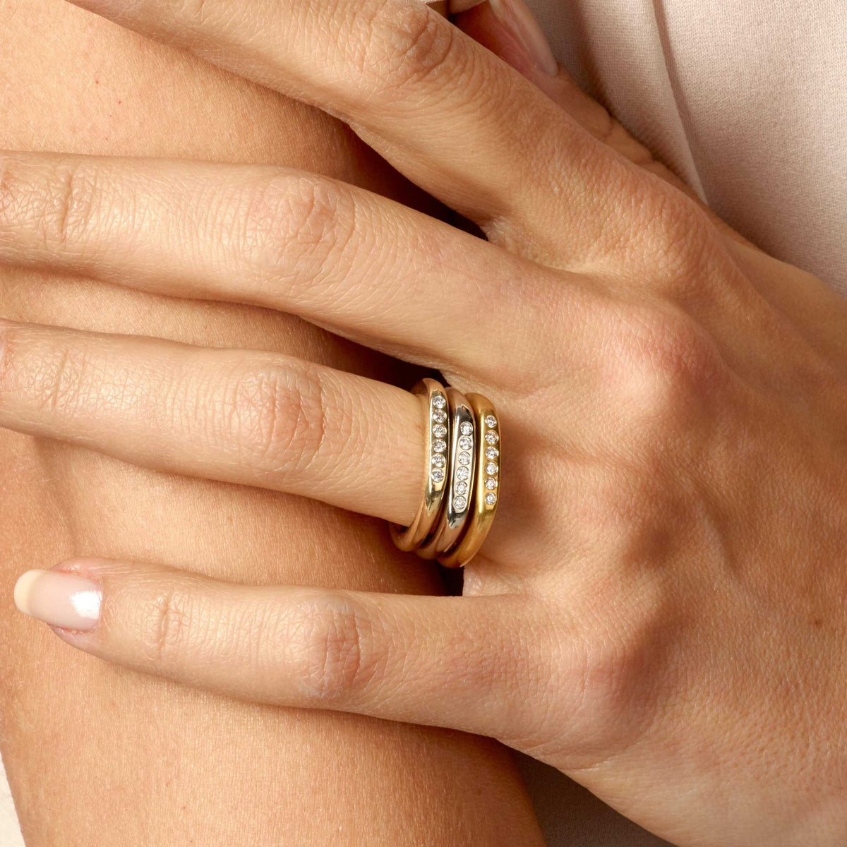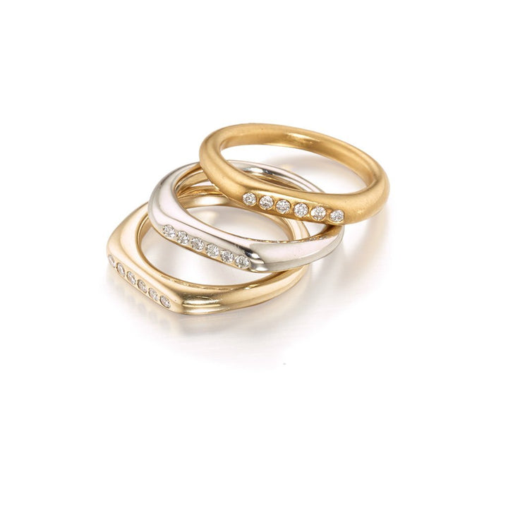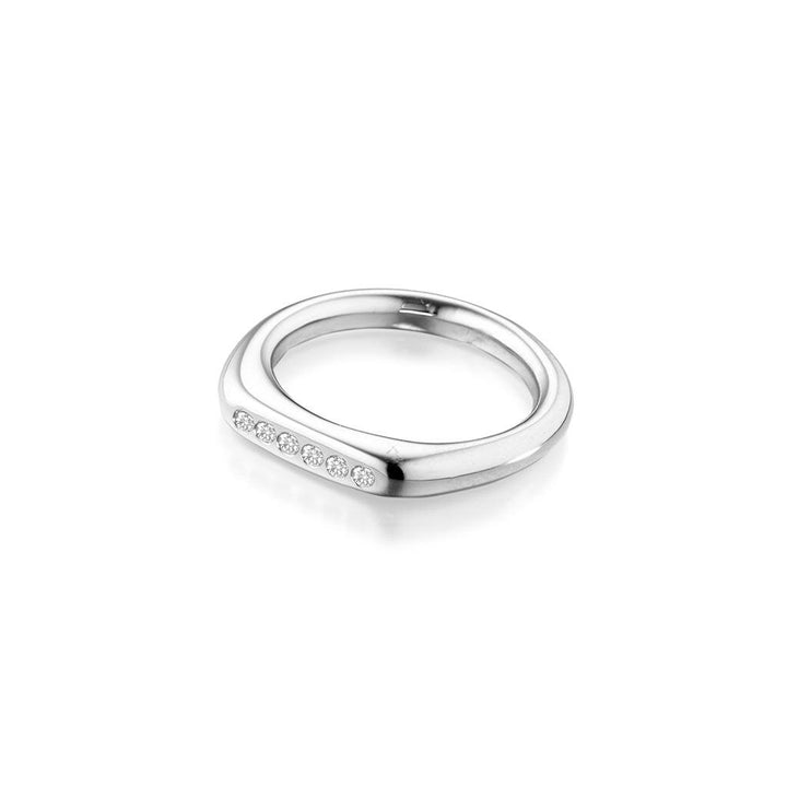 The Cherished Collection elevates classic jewelry with thoughtful twists on favorite styles. These personal keepsakes are intended to be worn every day as an expression of enduring love and friendship. The 19k white gold ring is set with six white diamonds. A lovely alternative engagement or wedding ring. Sleek, elegant, minimal.