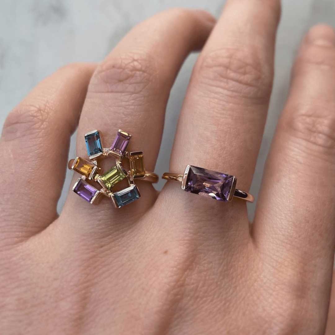 Emily created the pieces in her Jubilation collection to be breathtaking mini bursts of color. Unexpected and exciting, perfect for bringing moments of joy to everyday life. This statement ring has a beautiful presence and works well for everyday wear or at night. It features a rainbow of gemstone baguettes and is set in 14k yellow gold.