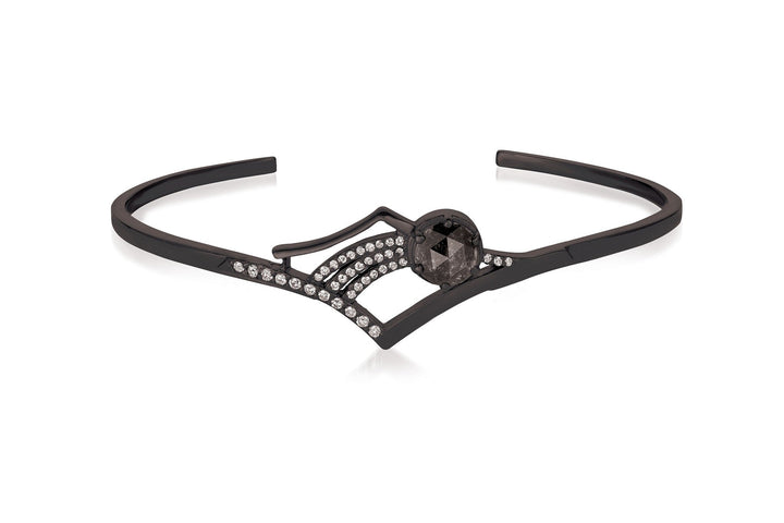 Available in 14k or 18k gold with a 7mm peridot, tsavorite garnets, and diamonds. Can be requested with or without black rhodium finish. Also available with a rose-cut black diamond and salt and pepper diamond melee. Sizes: small, medium, large.