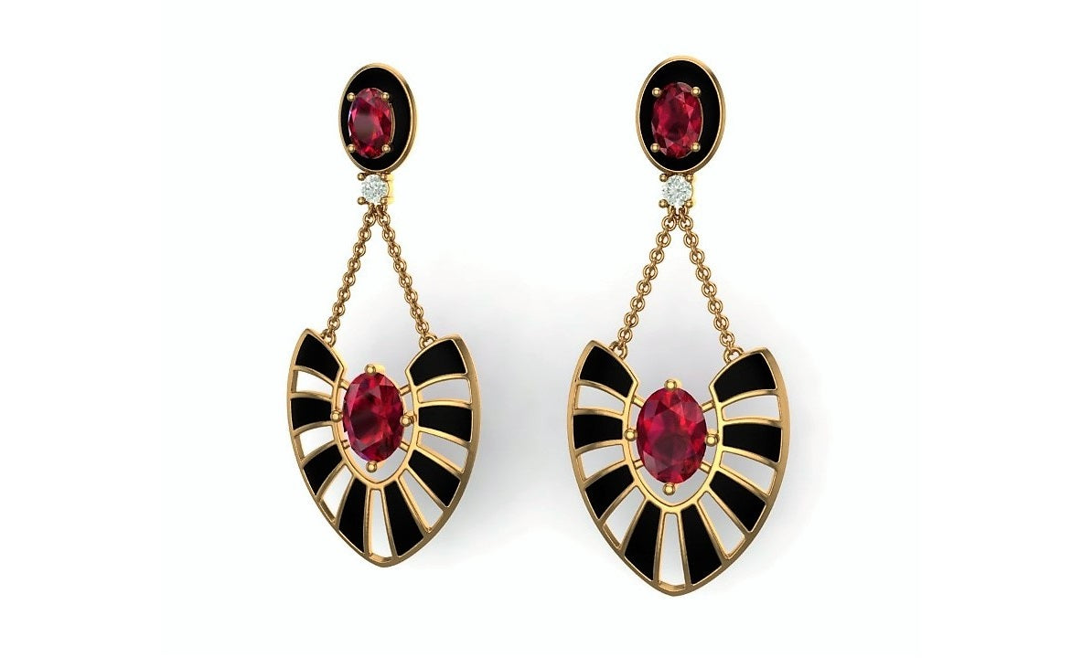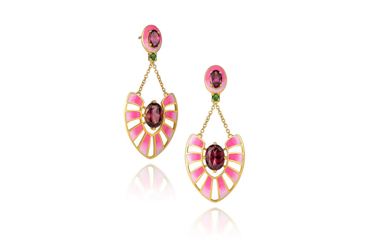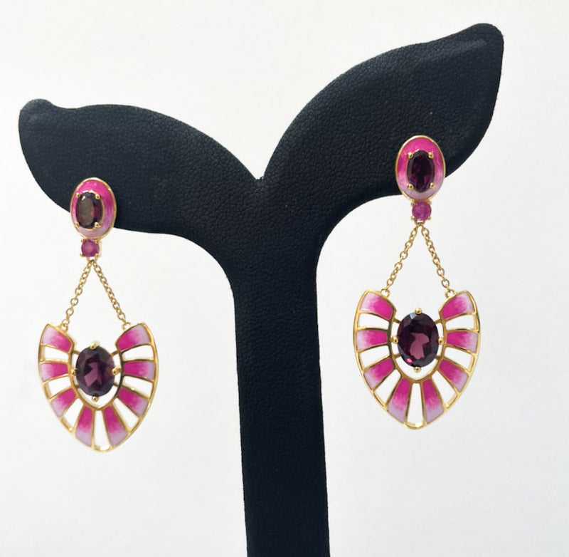 These APUS Dusk Earrings by Martha Seely are hand-painted with a vibrant 3-color enamel, featuring gorgeous rhodolite garnets and a touch of chrome diopside for a delightful pop of color. These earrings bring a burst of summer energy that you can enjoy all year long.