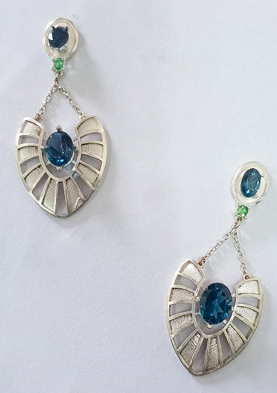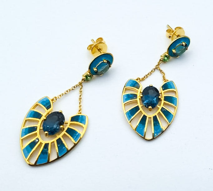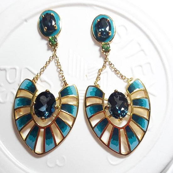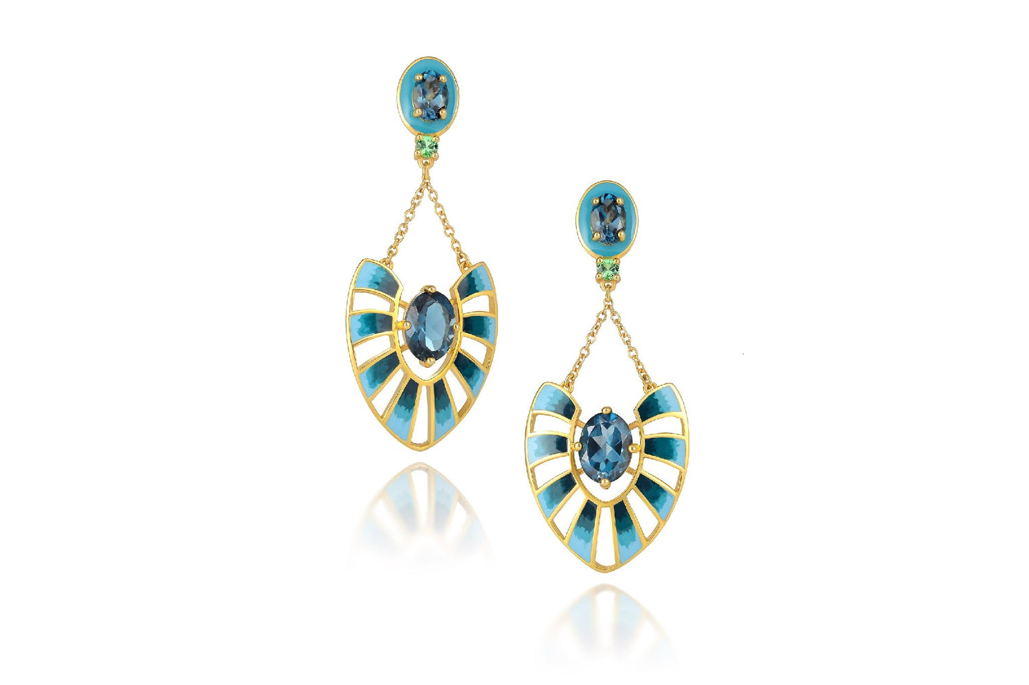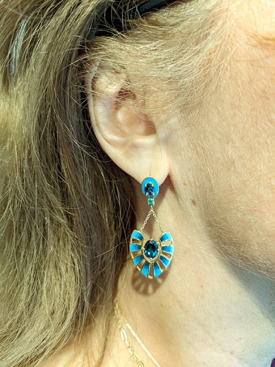 These APUS Horizon Earrings by Martha Seely are delicately hand-painted enamel earrings featuring faceted London Blue Topaz ovals with a vivid tsavorite accent for a special pop of color. Perfect for making a subtle yet striking statement. Available in yellow or white gold.
