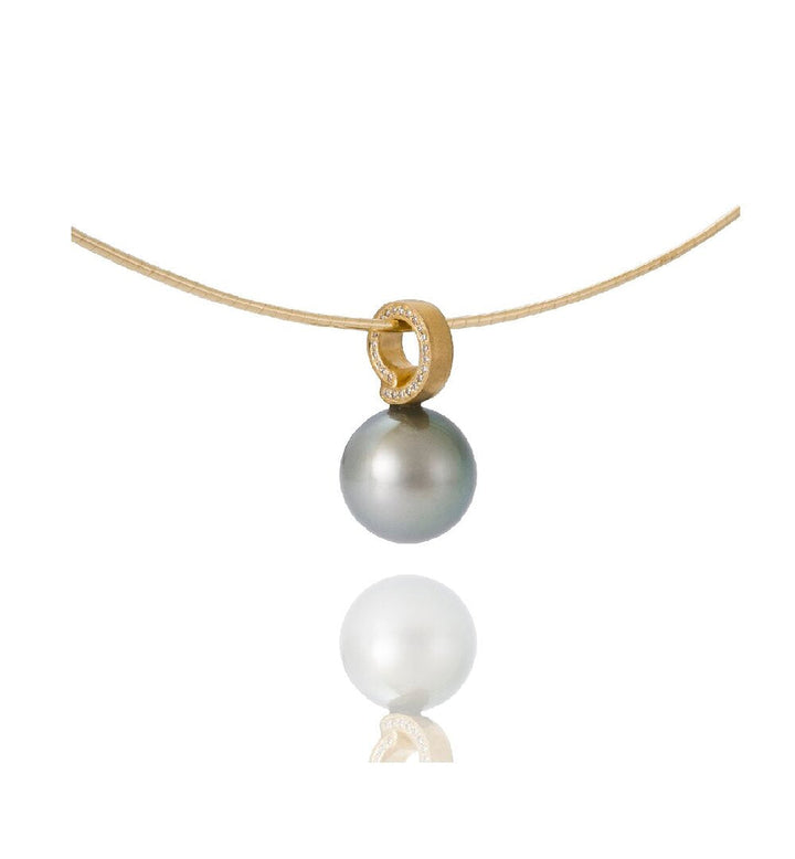 Handcrafted in 14k gold with an 11.1mm natural Tahitian pearl and 5 pave-set 2mm diamonds. Available with or without the gold neck wire. Each pearl is unique.