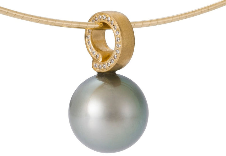 Crafted in 14k yellow gold with an 11.1mm natural Tahitian pearl and 0.9mm diamonds on each side. The front has a satin finish. Each pendant is unique due to the natural variations of the pearls. Available by order.