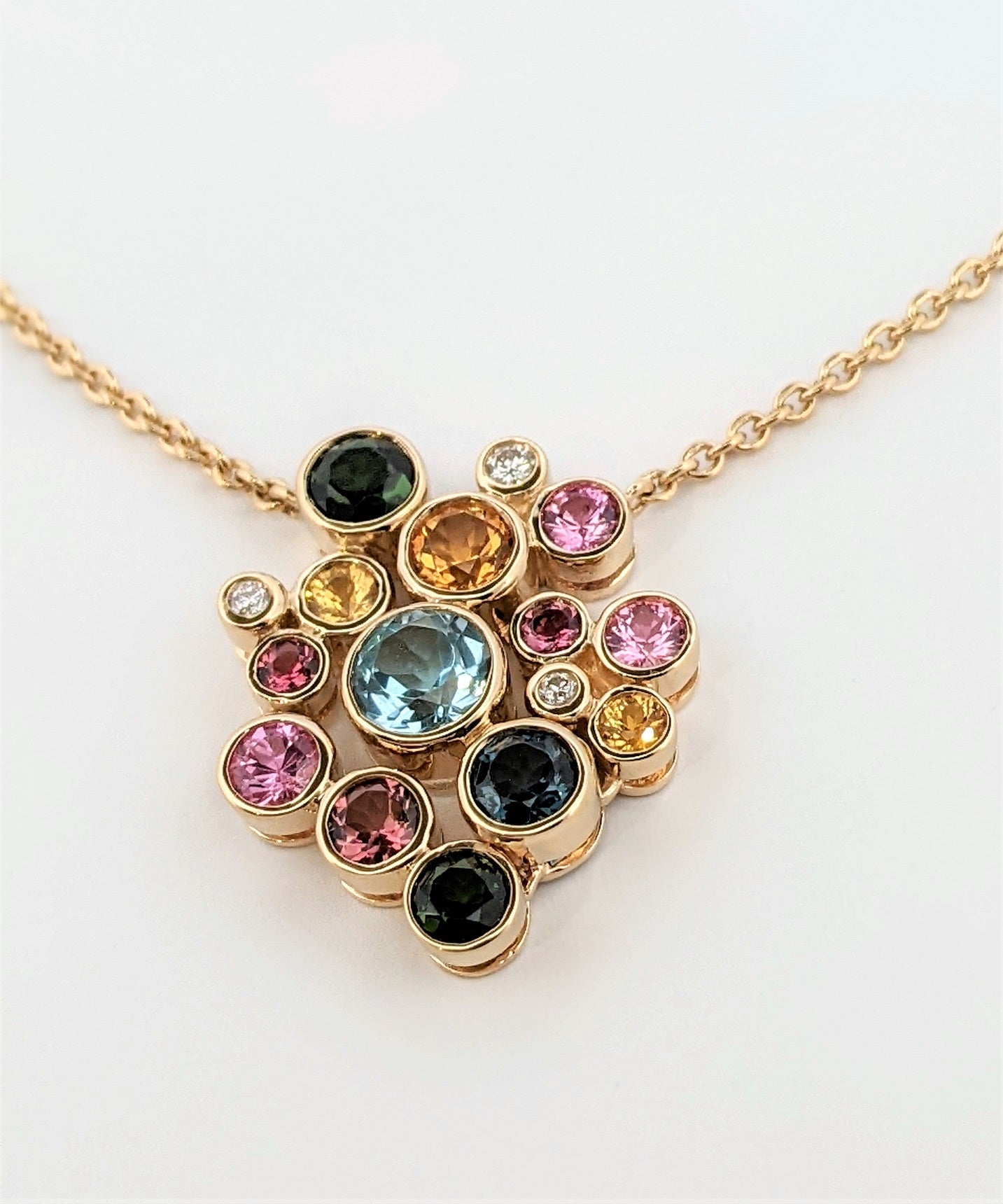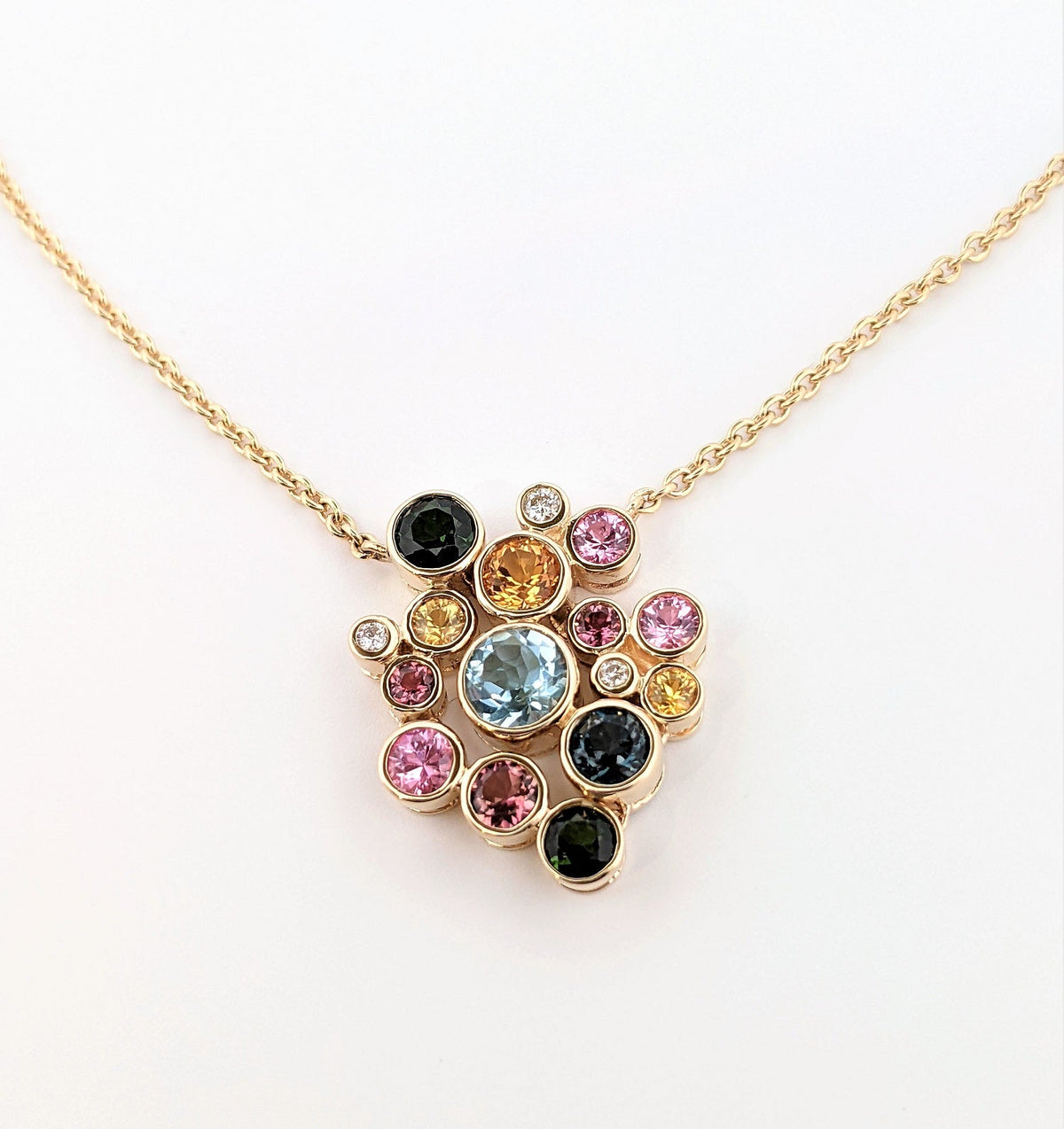 Handcrafted in 18k yellow gold (available in white or rose gold) with 1.75ct mixed-color gemstones and 0.0461ct diamonds. Pendant size: 0.80' L x 0.64' W on a delicate gold cable chain with a lobster clasp.