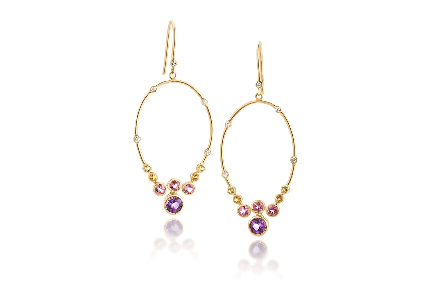 Handcrafted with 0.14ct diamonds, 2.17ct amethyst, yellow sapphire, citrine, and rhodolite garnet. Earring size: 1.5' L x 0.75' W.