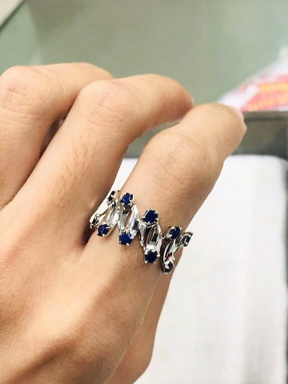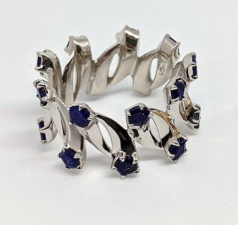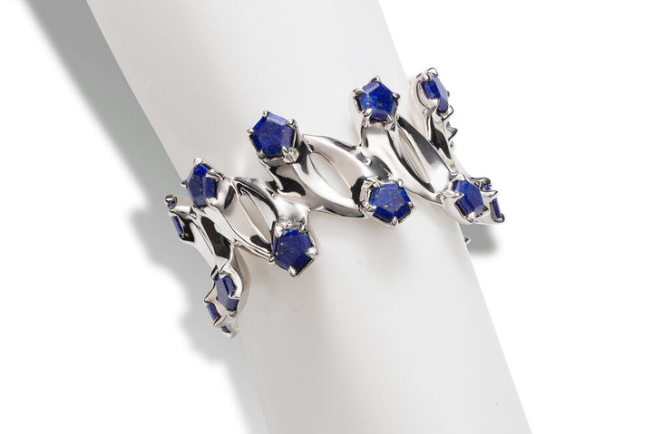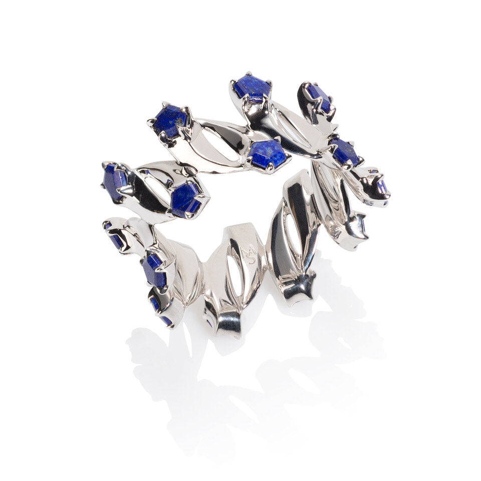 This Ice Meteor Ring with Lapis Lazuli by Martha Seely is a bold statement piece featuring eighteen connected meteors with fancy-cut lapis lazuli gemstones. Whether as a fashion ring, a statement ring, or even a promise ring, its polished design fits smoothly on any finger.